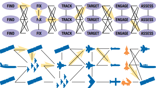 美国空军在21世纪初正式将这一过程编码为“发现、锁定、跟踪、定位、交战、评估”循环,该循环至今仍是联合目标锁定理论的核心。随着时间的推移,这一概念已从战术领域扩展到战役和战略层面的关联。在战术层面,杀伤链的运作以秒或分钟计,例如在反恐突袭或无人机打击中。在战役层面,它们跨越数小时或数天,在整个战区协调多种火力与情报、监视和侦察资产。在战略层面,杀伤链的展开可能需要数周或数月,将国家情报、后勤和工业动员整合到战役规划中。