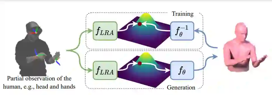 图1 通过稀疏的HMD输入,我们生成了一个完整的化身(头和手的三个SE3s),通过训练一个基于流的生成模型,该模型提供了基础分布和三维人体姿态分布之间的可逆映射。在测试时,给定HMD信号,我们预测潜在空间中的一个区域,该区域用作基于流的模型的输入,以生成一个姿势
