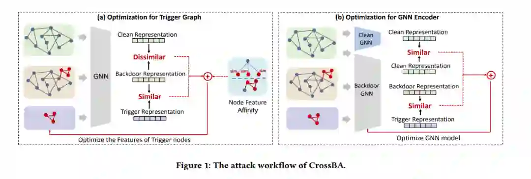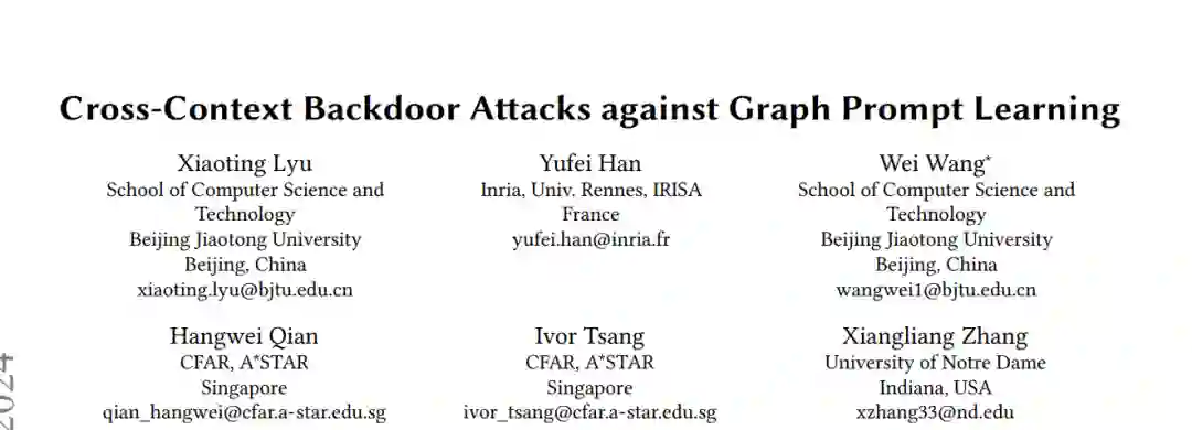 图提示学习(Graph Prompt Learning,GPL)在预训练与下游应用之间架起了重要桥梁,以缓解现实世界中图学习的知识传递瓶颈。虽然GPL在图知识传递和计算效率方面具有卓越的效果,但预训练模型中嵌入的后门中毒效应所带来的安全风险尚未得到充分探索。我们的研究对GPL易受后门攻击的脆弱性进行了全面分析。我们介绍了CrossBA,这是首个针对GPL的跨上下文后门攻击,仅在预训练阶段进行操作,无需了解下游应用。我们的研究在理论和实证上揭示了,通过调整触发图结合提示转换,可以无缝地将后门威胁从预训练编码器转移到下游应用。通过对涉及5个不同跨上下文场景和5个基准数据集的节点和图分类任务的3种代表性GPL方法进行广泛实验,我们证明了CrossBA在保持下游应用对干净输入功能的同时,一直能够实现高攻击成功率。我们还探索了针对CrossBA的潜在对策,并得出结论,当前的防御措施不足以缓解CrossBA。我们的研究强调了GPL系统中持续存在的后门威胁,提升了对GPL技术实践中信任问题的关注。