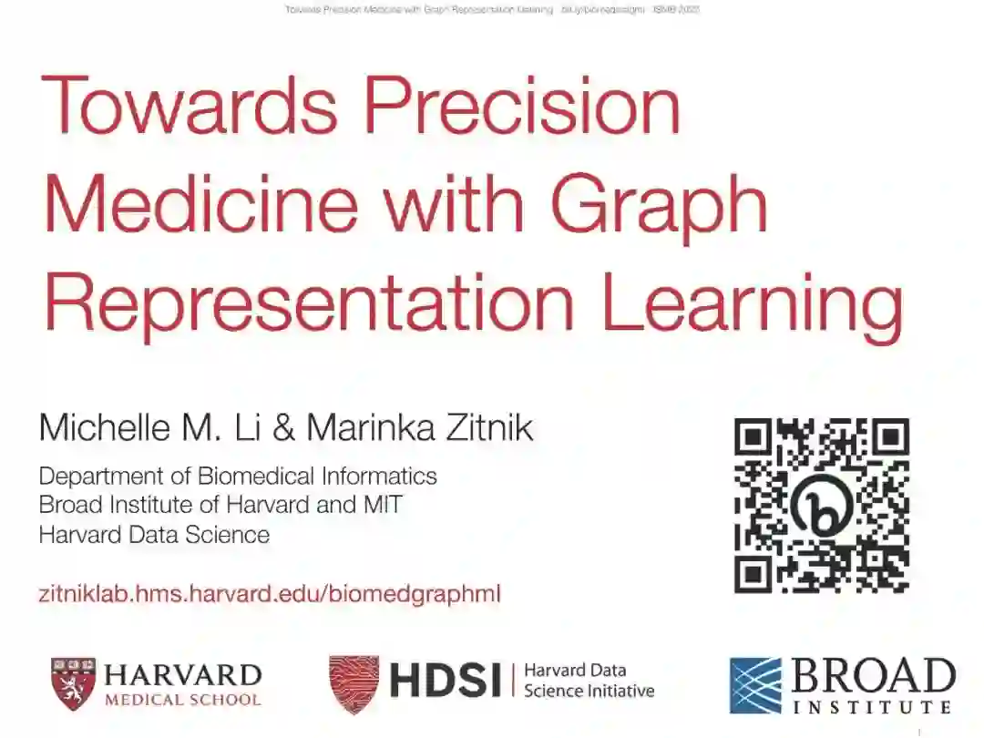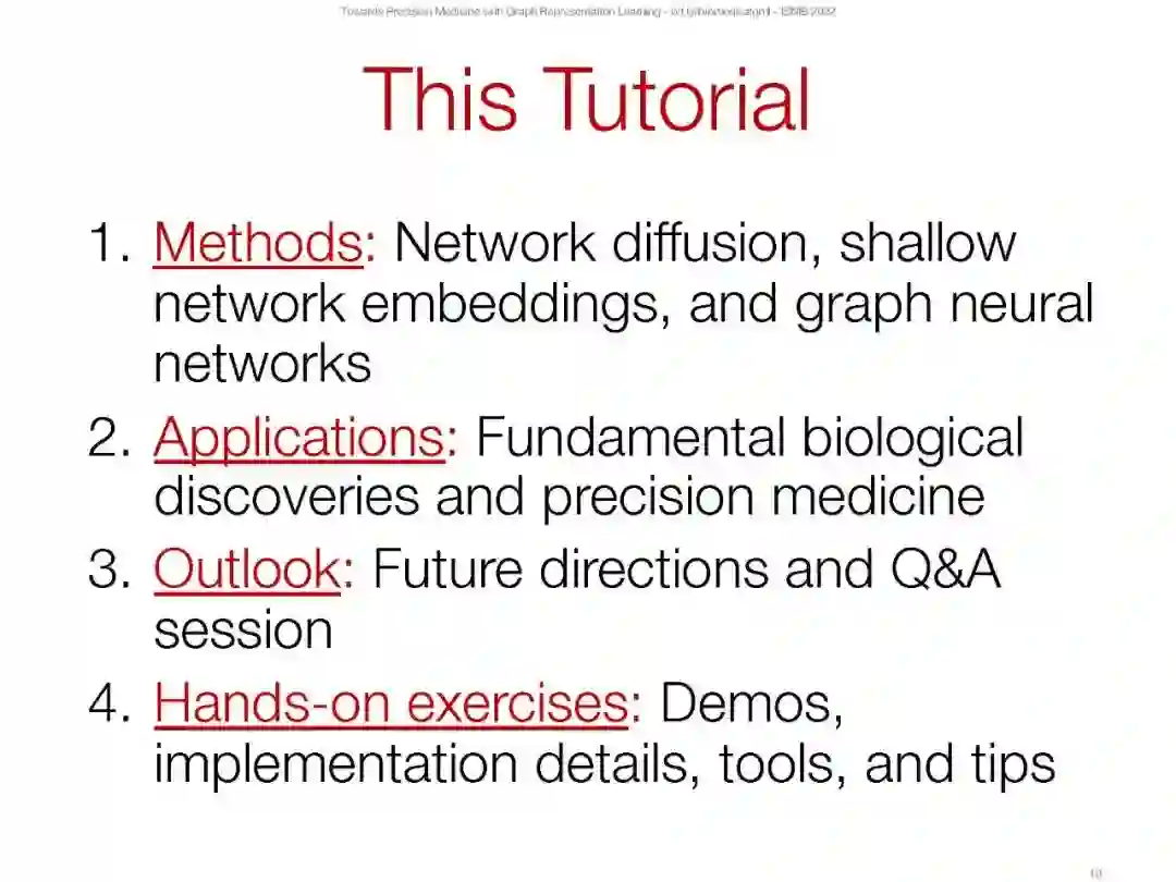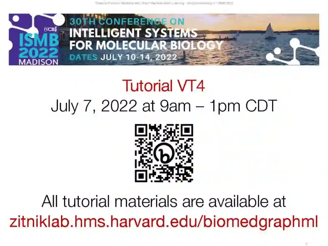 图表示学习,也被称为图上的机器学习,几何深度学习,或图神经网络(GNNs),已经成为网络数据集深度学习的领先范式。图的深度学习尤其具有挑战性,因为图包含复杂的地形结构,没有固定的节点排序,也没有参考点。图还可以包含许多不同类型的实体(节点)和相互关联的富交互(边)。经典的深度学习方法无法考虑如此多样的结构属性和丰富的交互,这是网络的本质,因为它们是为固定大小的网格(即图像和表格数据集)或序列(即文本)设计的。类似于图像和文本的深度学习如何彻底改变了图像分析和自然语言处理领域,图表示学习的进步使科学界能够更广泛地使用深度学习,不仅用于图像和文本数据集,而且用于任何相互连接的、联网的数据系统。这些算法的进步为深度学习在生物和医学领域的应用创造了新的前沿。此外,他们促进了生物和医学的科学创新,我们将在教程中介绍。因此,为了进一步刺激算法和科学创新,我们的教程旨在为广大科学受众提供关于生物医学中的图表示学习的综合和回顾。