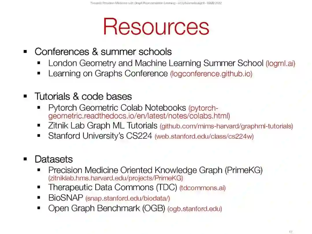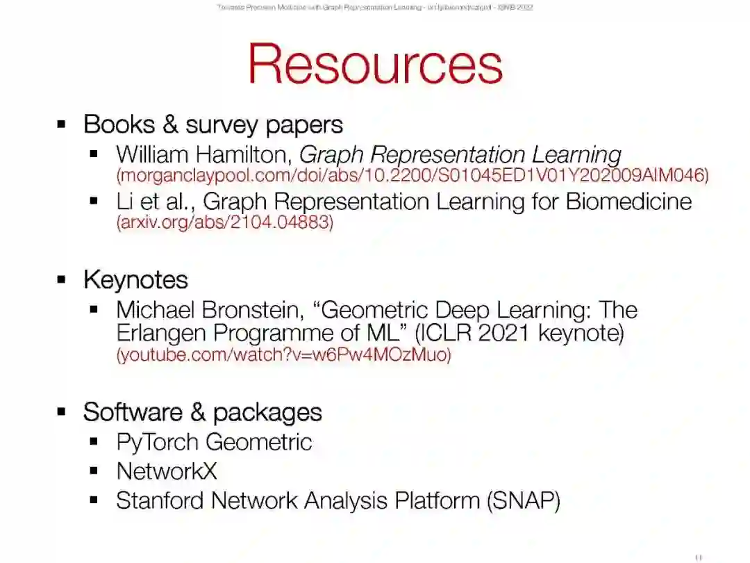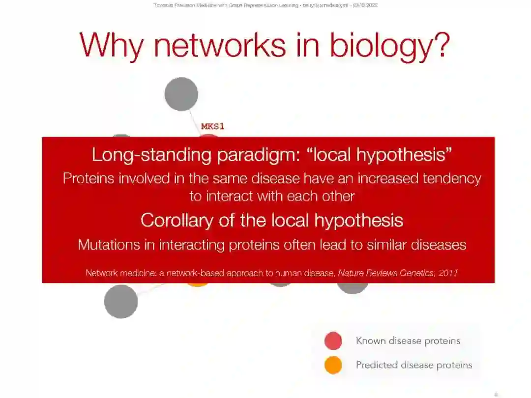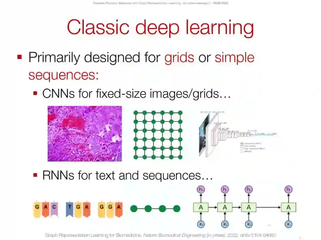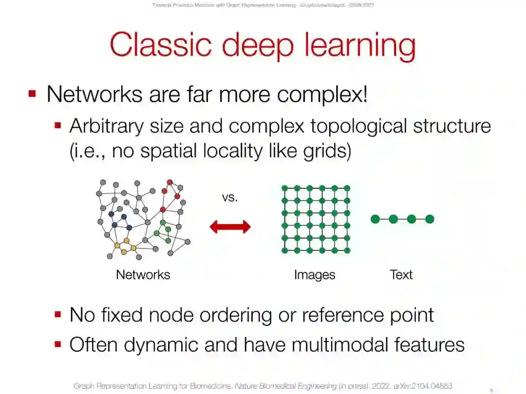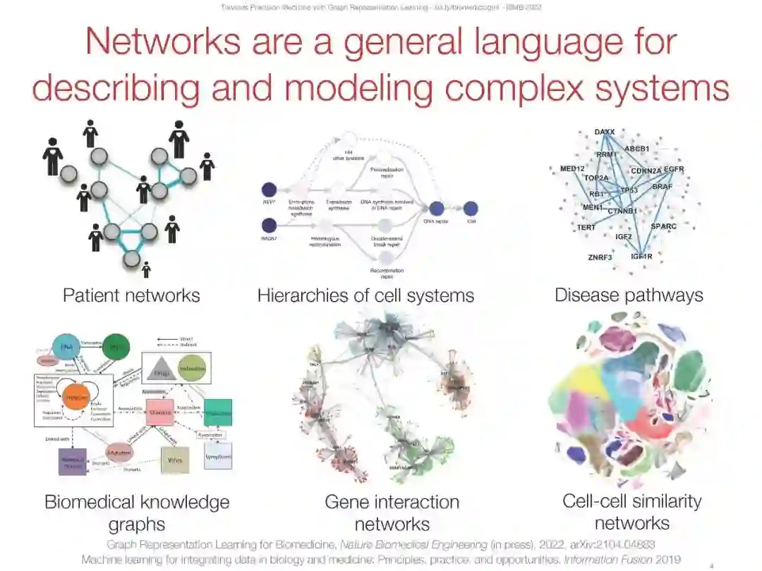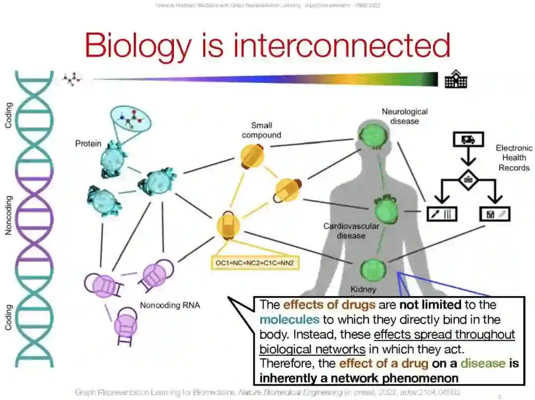 网络(或图表)在生物学和医学中无处不在,从分子相互作用图到人口规模的社会和健康相互作用。例如,分子结构可以分别从原子和键转换为节点和边;蛋白质相互作用自然形成了一个基于物理相互作用或功能关系存在的网络;网络可以由药物(例如,小化合物)、蛋白质和疾病组成,以便建模药物-药物相互作用、药物与靶蛋白的结合以及识别药物-疾病治疗机会;病人记录可以表示为网络,其中边缘可能表示医疗代码在健康记录中共同出现。