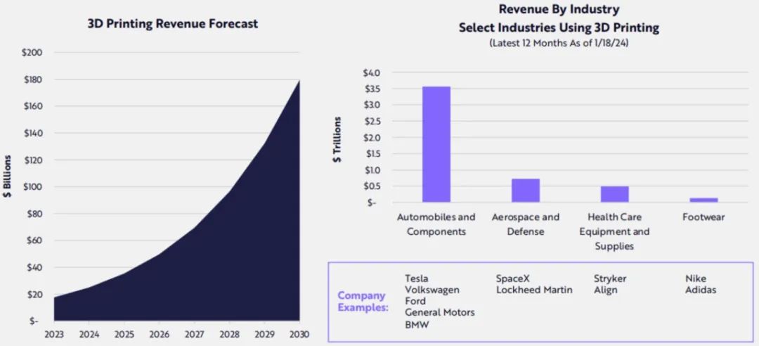 Big Ideas 2024 未来七年内,3D打印技术的收入预计每年以约40%的速度增长,从今天的约180亿美元增长到2030年的约1800亿美元。其中3D打印技术将为汽车行业降低零部件数量和产品开发周期,为医疗行业提供新的手术技术方案,为制造业带来可循环改变方案。 报告指出,特斯拉正在试验3D打印砂模来铸造汽车车身底部,可以用一个零件代替400个零件,汽车开发时间和模具设计验证成本分别降低50%和97%。3D打印可以在每辆汽车的生产中发挥作用。 医疗领域,在一系列手术中,3D打印工具、指南和模型的性能提高了约40-50%,手术时间平均减少了约30%。