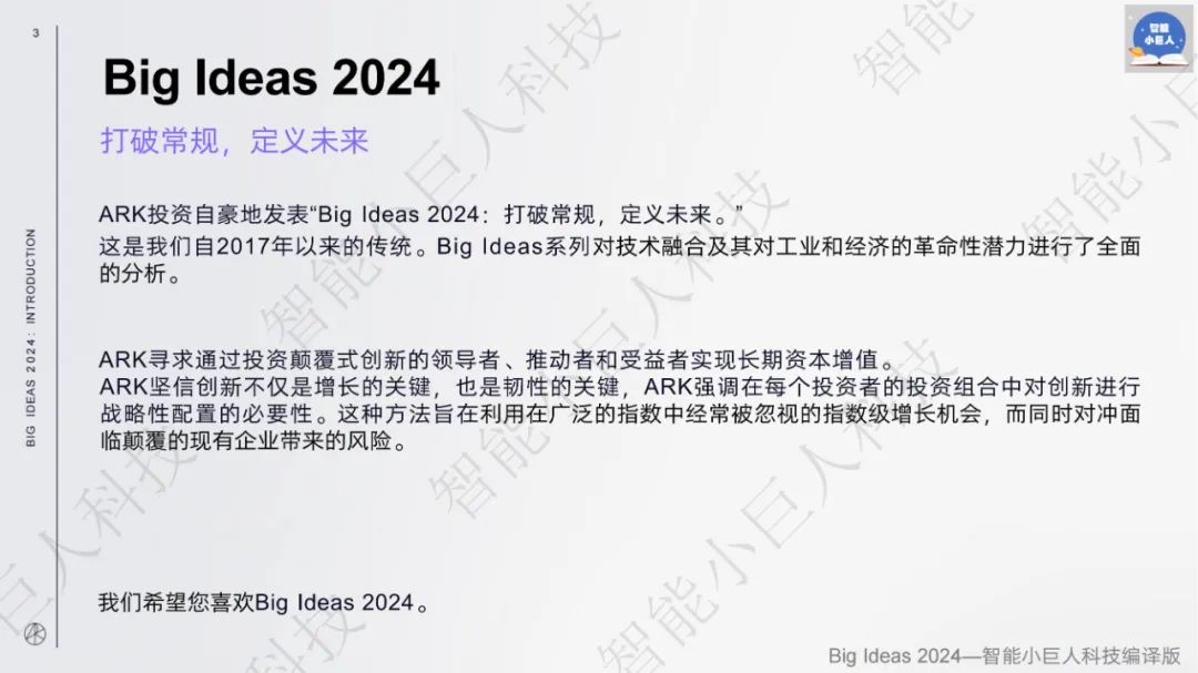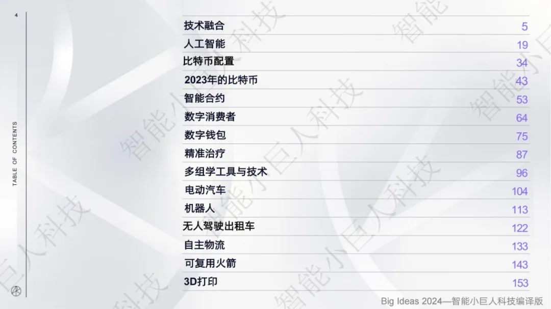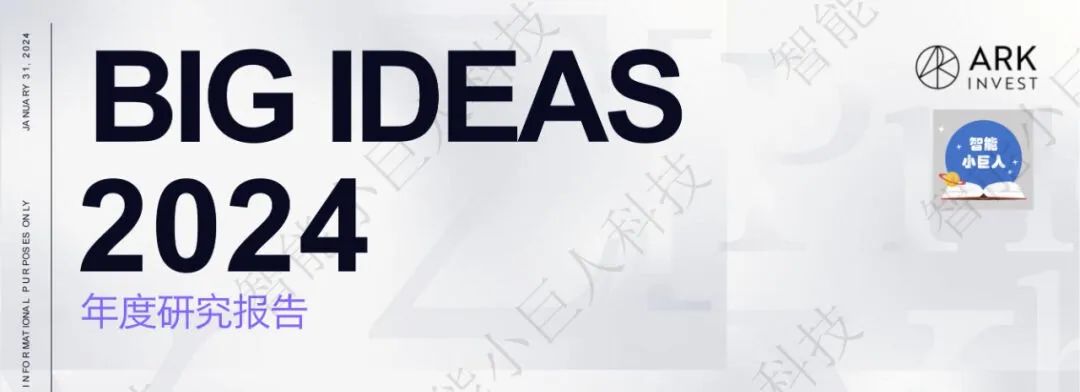 近日,被誉为“科技投资女王”的华尔街明星基金经理、方舟投资管理公司的首席执行官“木头姐”凯茜·伍德(Cathie Wood)带领她的ARK研究团队发布了《Big Ideas 2024》报告。自2017年以来,其团队每年发布的《Big Ideas》报告更是以极高的含金量,成为全球科技创业者与投资者的重要参考资料。 这份长达163页的报告,ARK从技术融合、人工智能、比特币、智能合约、精准治疗、多组学工具和技术、电动车、自动驾驶出租车、机器人技术、自主物流、可回收火箭和3D打印等方面对技术融合及其变革行业和经济的潜力进行了全面分析。