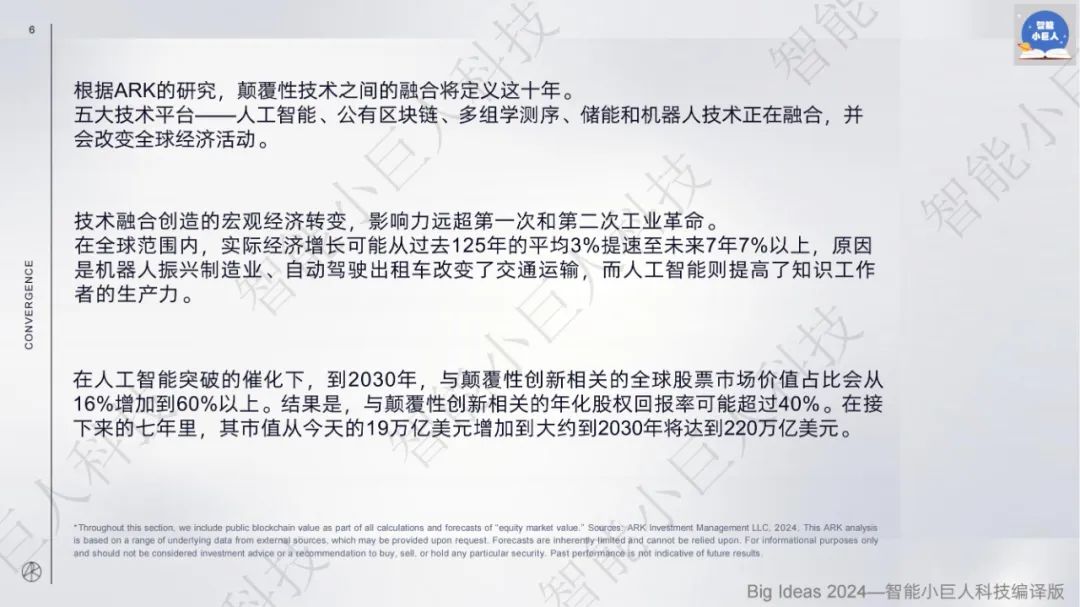 Big Ideas 2024 ARK的研究指出,颠覆性技术之间的融合是未来十年的重点,其中人工智能、公有区块链、多组学测序、储能和机器人技术五大技术平台,正在掀起的历史性浪潮,将重新定义这个时代。影响力远超第一次和第二次工业革命。 AI的发展速度超出了人们的预期,通用人工智能技术的发展一直在加速,从2019年预期需要80年才能推出,到2023年时该预期已经变成了8年,此前预测AI技术要到2030年才能成熟应用,但如果预测误差继续存在,也许到2026年就能实现目标。 颠覆式创新公司在全球股市的占比将从16%增加到60%以上,未来几年的年回报率可能超过40%,其市值将从今天的19万亿美元增加到2030年的220万亿美元。