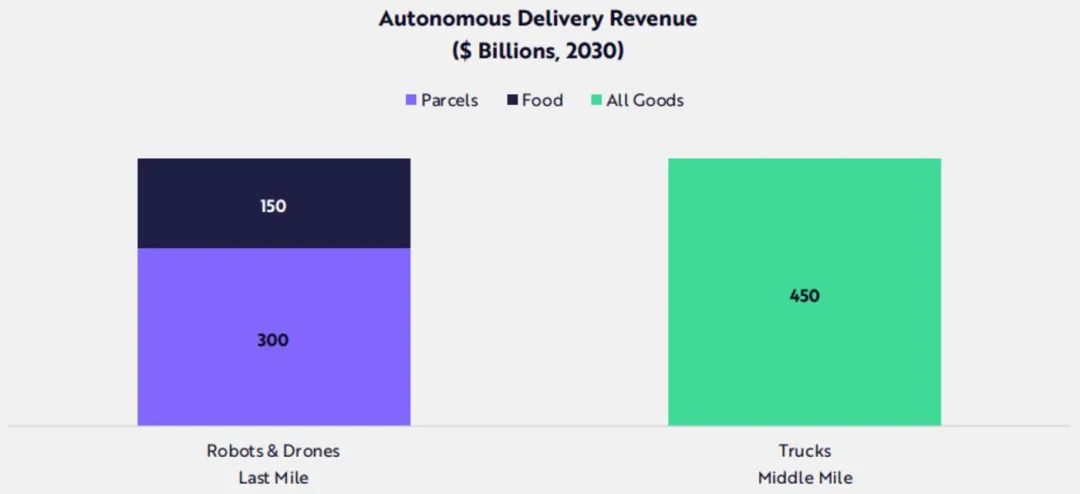 Big Ideas 2024 未来5到10年内,自主物流将把货物运输成本降低15倍。自主无人机和机器人届时将完成数百万次交付,而自主卡车运输公司记录了数千万英里,并且无需安全驾驶员。 根据ARK的研究,到2030年全球自动配送收入将达到9000亿美元,机器人和无人机的食品和包裹递送费用将达到4500亿美元,自动驾驶卡车运输收入也将达到4500亿美元。