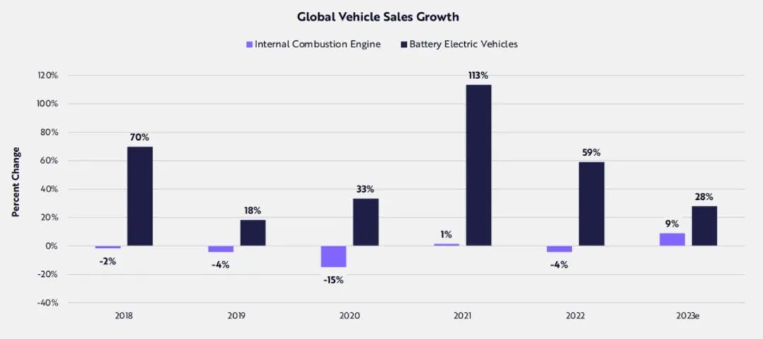 Big Ideas 2024 随着电池成本成本的下降,将推动电动汽车(EV)价格下滑,预计2030年电动汽车将占车辆总量的95-100%,未来7年电动汽车销量将以每年33%的速度增长,从2023年的1000万辆增至2030年的7400万辆。 ARK指出,电动汽车正在从内燃机汽车手中夺走市场份额,如果持续发展,燃油车制造商可能会被迫重组和整合。