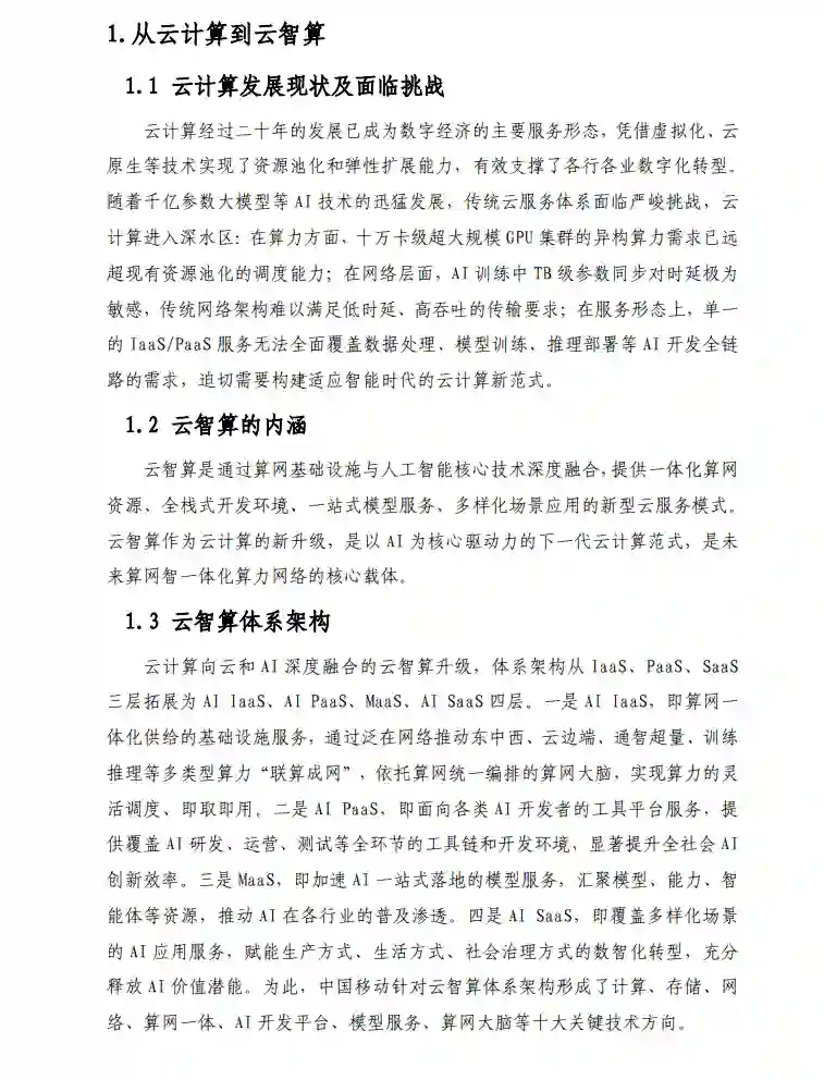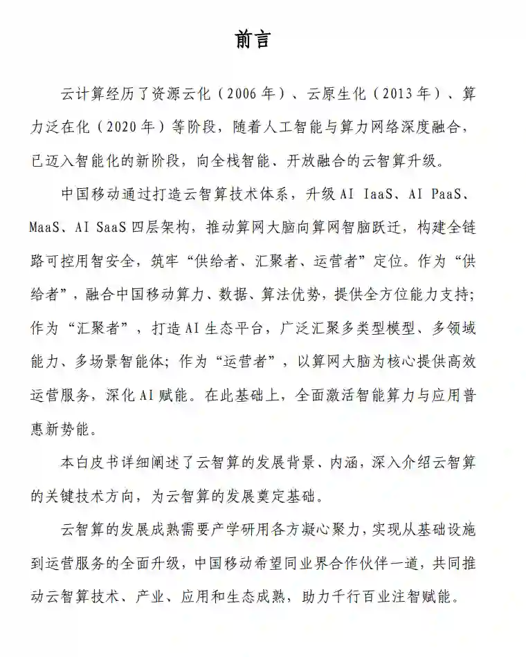云计算经历了资源云化(2006年)、云原生化(2013年)、算力泛在化(2020年)等阶段,随着人工智能与算力网络深度融合,已迈入智能化的新阶段,向全栈智能、开放融合的云智算升级。中国移动通过打造云智算技术体系,升级AIIaaS、AIPaaS、MaaS、AISaaS四层架构,推动算网大脑向算网智脑跃迁,构建全链路可控用智安全,筑牢“供给者、汇聚者、运营者”定位。作为“供给者”,融合中国移动算力、数据、算法优势,提供全方位能力支持;作为“汇聚者”,打造AI生态平台,广泛汇聚多类型模型、多领域能力、多场景智能体;作为“运营者”,以算网大脑为核心提供高效运营服务,深化AI赋能。在此基础上,全面激活智能算力与应用普惠新势能。