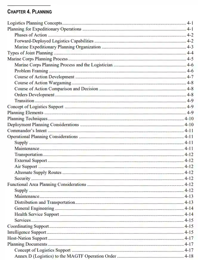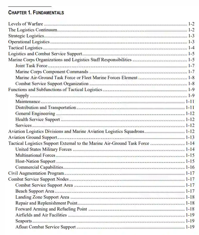 美海军陆战队战术出版物(MCTP)3-40B《战术后勤》为海军陆战队基地与后勤体系提供的战术地面及航空后勤保障规划与实施确立了条令基础。海军陆战队战术出版物3-40B对3-40《海军陆战队后勤》进行扩展,为海军陆战队后勤人员在战术层级实施后勤行动提供详细指导,并确立了战术后勤与战斗勤务支援行动的标准术语参考。本出版物主要面向负责在战术作战层级规划与实施后勤行动的指挥官及其参谋人员;次要受众为需要获取后勤保障或需加深理解战术层级保障的指挥官与参谋军官。