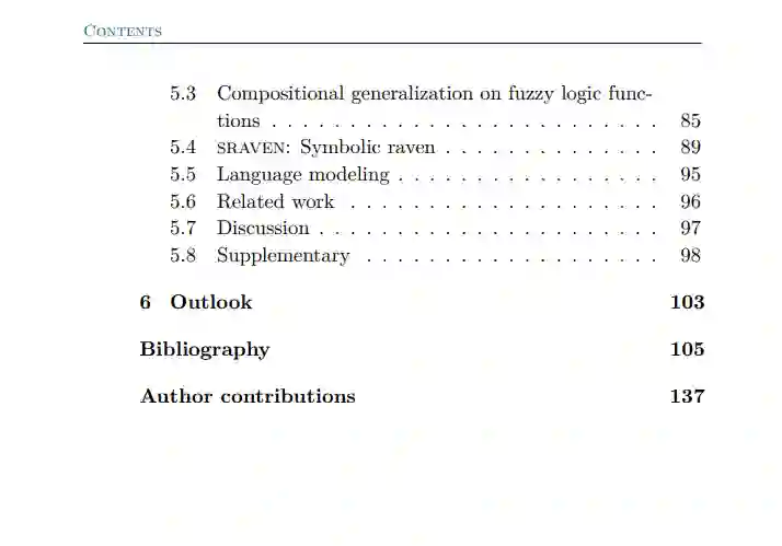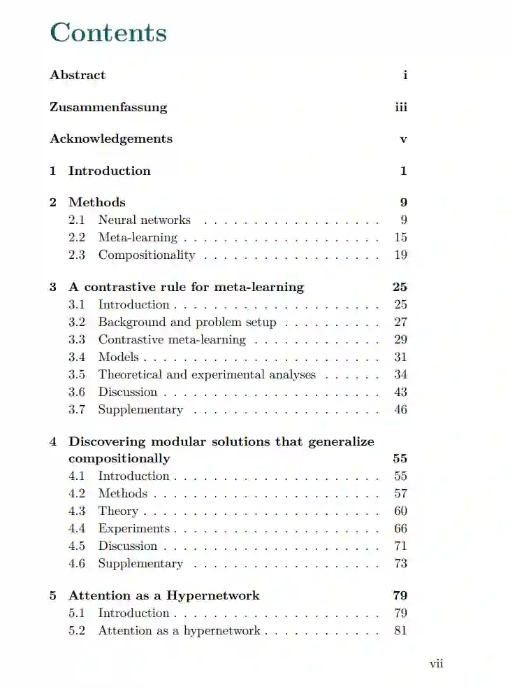 第三部分中,我们研究了在 Transformer 中的元学习,具体是在上下文中处理组合任务的能力。我们在形式上建立了 Transformer 的多头注意力机制与超网络之间的联系。这一联系表明 Transformer 可能通过一种隐式超网络的潜在编码(latent code)来重用和重组操作。我们在两个抽象推理任务中实证验证了这一假设,发现所学网络在面对新组合任务时使用的子任务函数与其潜在编码之间存在结构化的功能关系。 总体而言,我们的研究揭示了神经网络在元学习和组合泛化方面的潜力。最后,我们展望了这一研究方向的若干前沿问题,特别是在机器学习与神经科学都在迅猛发展的背景下,神经网络研究所面临的机遇与挑战。