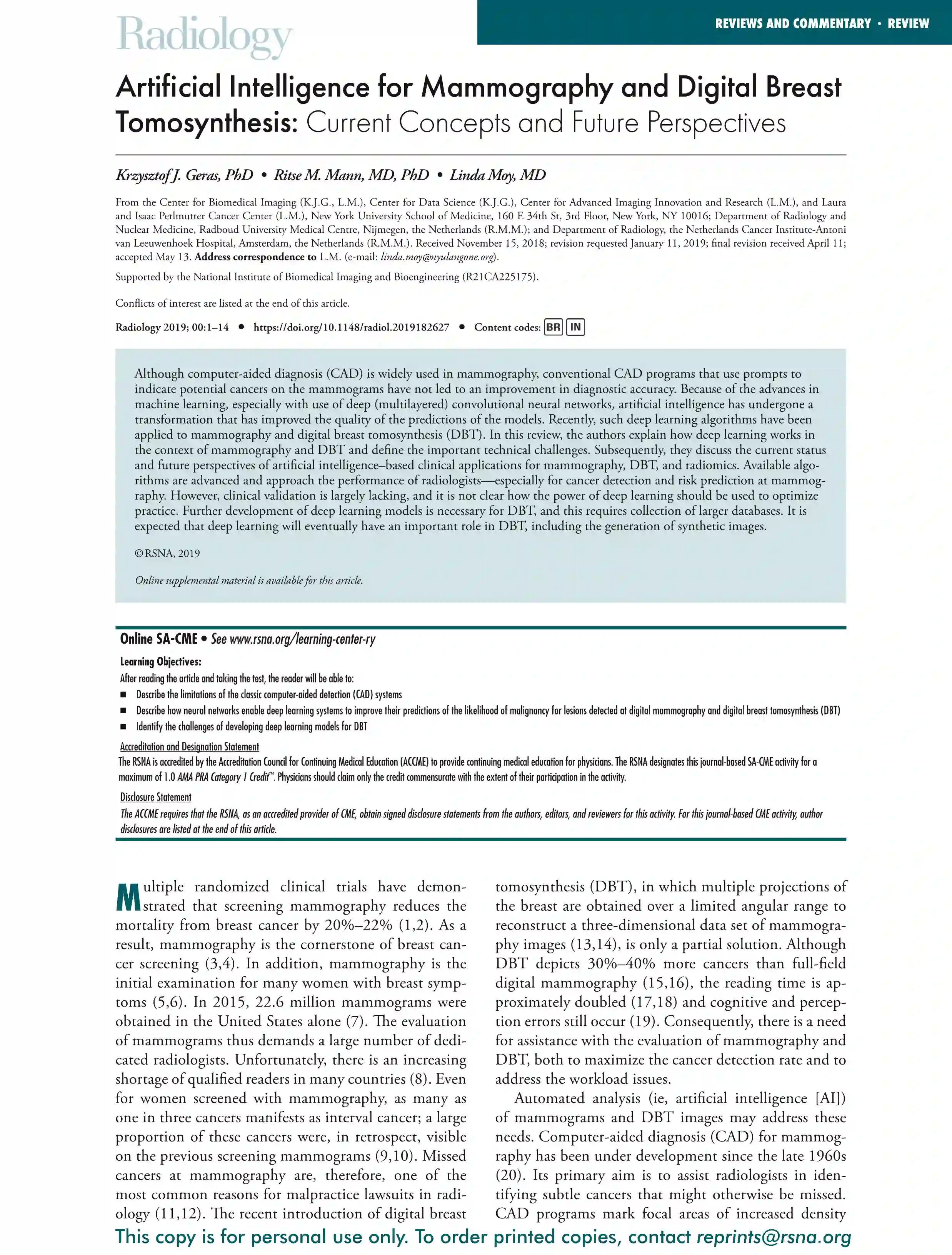 人工智能乳房x线照相术和数字化乳房人工合成:当前的概念和未来的展望综述论文】Artificial Intelligence for Mammography and Digital Breast Tomosynthesis: Current Concepts and Future Perspectives