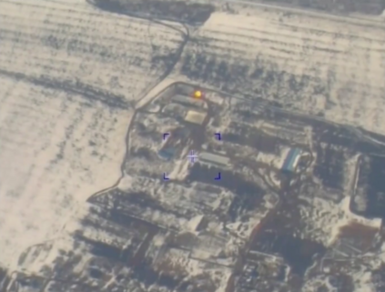 "海鹰-10"摄像头拍摄的俄军炮击观测画面。镜头十字准星颜色变化是该机型视频流显著特征。[俄罗斯国防部]