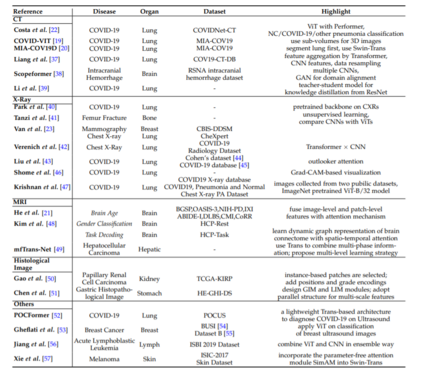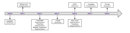 最近,Transformer还将医学图像分析领域用于疾病诊断[19]、[20]、[21]和其他临床用途。如[22],[23]的工作利用transformer通过CT或x线影像区分COVID-19和其他类型的肺炎,满足了快速有效治疗COVID-19患者的迫切需求。此外,transformer还成功地应用于图像[24]分割、[25]检测和[26]合成,取得了非常先进的效果。图1显示了Transformer对不同医学图像应用的时间适应性,将在第3节中进一步讨论。
