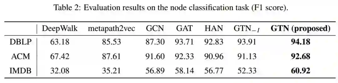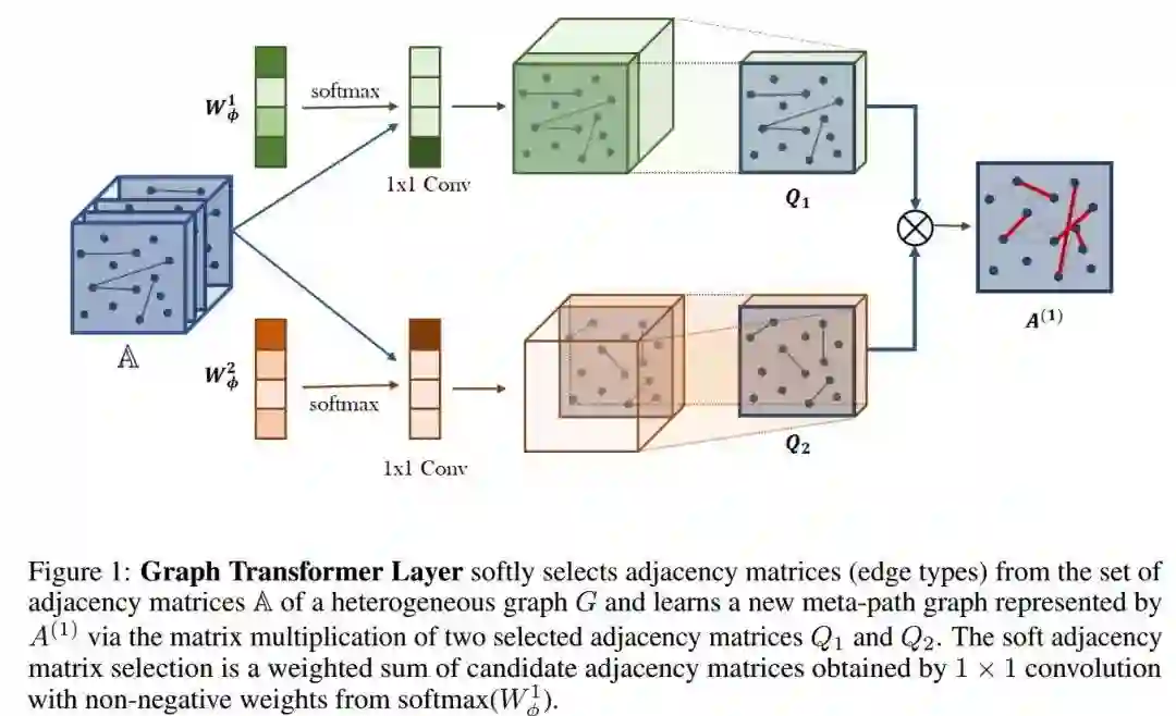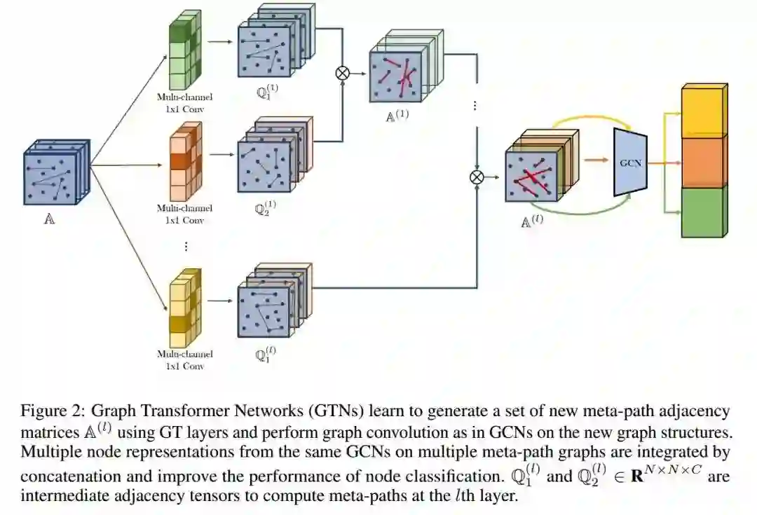 图神经网络(GNNs)在图表示学习中得到了广泛的应用,实现了节点分类和连接预测等任务的最佳性能。然而,大多数现有的GNNs都被设计为在固定(fix)和同质(homogeneous)的图上学习节点表示。当在不确定的图或由各种类型的节点和边组成的异构(heterogeneous)图上学习表示时,这些限制尤其成问题。本文提出了能够生成新的图结构的图变换网络(Graph Transformer Networks, GTNs),它涉及在原始图上识别未连接节点之间的有用连接,同时以端到端方式学习新图上的有效节点表示。图变换层是GTNs的核心层,学习边类型和复合关系的软选择,以产生有用的多跳连接,即所谓的元路径。我们的实验表明,GTNs基于数据和任务,在没有领域知识(domain knowledge)的情况下学习新的图结构,并通过在新图上的卷积产生强大的节点表示。在没有域特定的图预处理的情况下,GTNs在所有三个benchmark节点分类任务中实现了对比需要领域知识的预定义的元路径的现有技术方法的最佳性能。本文提出了能够生成新的图结构的图变换网络(Graph Transformer Networks, GTNs),该方法将异构图转化为由任意边类型和任意长度的元路径定义的多个新图,同时通过对学习到的元路径图进行卷积学习节点表示。GTN打破了手工构建元路径的现状,构建了自动化的图生成及表示学习模式。