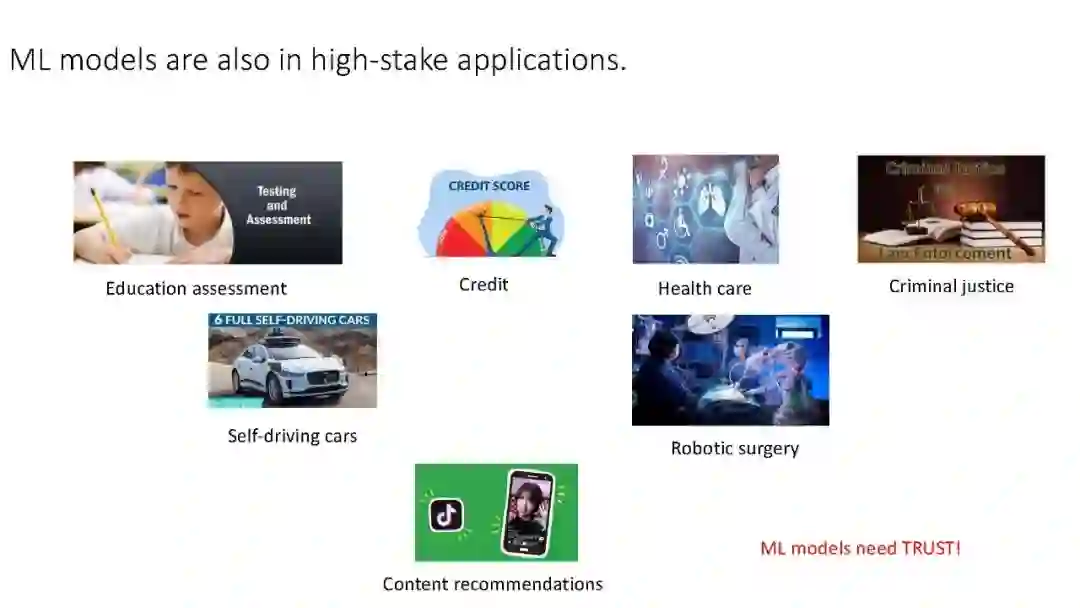 教育评估、信贷、就业、医疗保健和刑事司法等高风险应用的决策越来越受到数据驱动,并由机器学习模型支持。机器学习模型也使关键的信息物理系统,如自动驾驶汽车和机器人手术成为可能。在过去的几年里,机器学习领域取得了惊人的进展。然而,即使这些技术越来越多地融入我们的生活,记者、活动家和学者仍发现了一些侵蚀这些系统可信度的特征。例如,据报道,一个支持法官审前拘留决定的机器学习模型对黑人被告存在偏见。同样,据报道,一个支持在一家大型科技公司进行简历筛选的模型也对女性有偏见。研究表明,用于胸部x光片疾病计算机辅助诊断的机器学习模型更重视图像中的标记,而不是患者的解剖细节。自动驾驶汽车的死亡事故发生在不同寻常的条件下,根本的机器学习算法没有经过训练。简而言之,虽然每天都有机器学习算法在某些任务上取得超人成绩的新故事,但这些惊人的结果只是在一般情况下。我们在所有情况下信任这些算法所需要的可靠性、安全性和透明度仍然是难以捉摸的。因此,越来越多的人希望在这些系统中拥有更多的公平性、健壮性、可解释性和透明度。