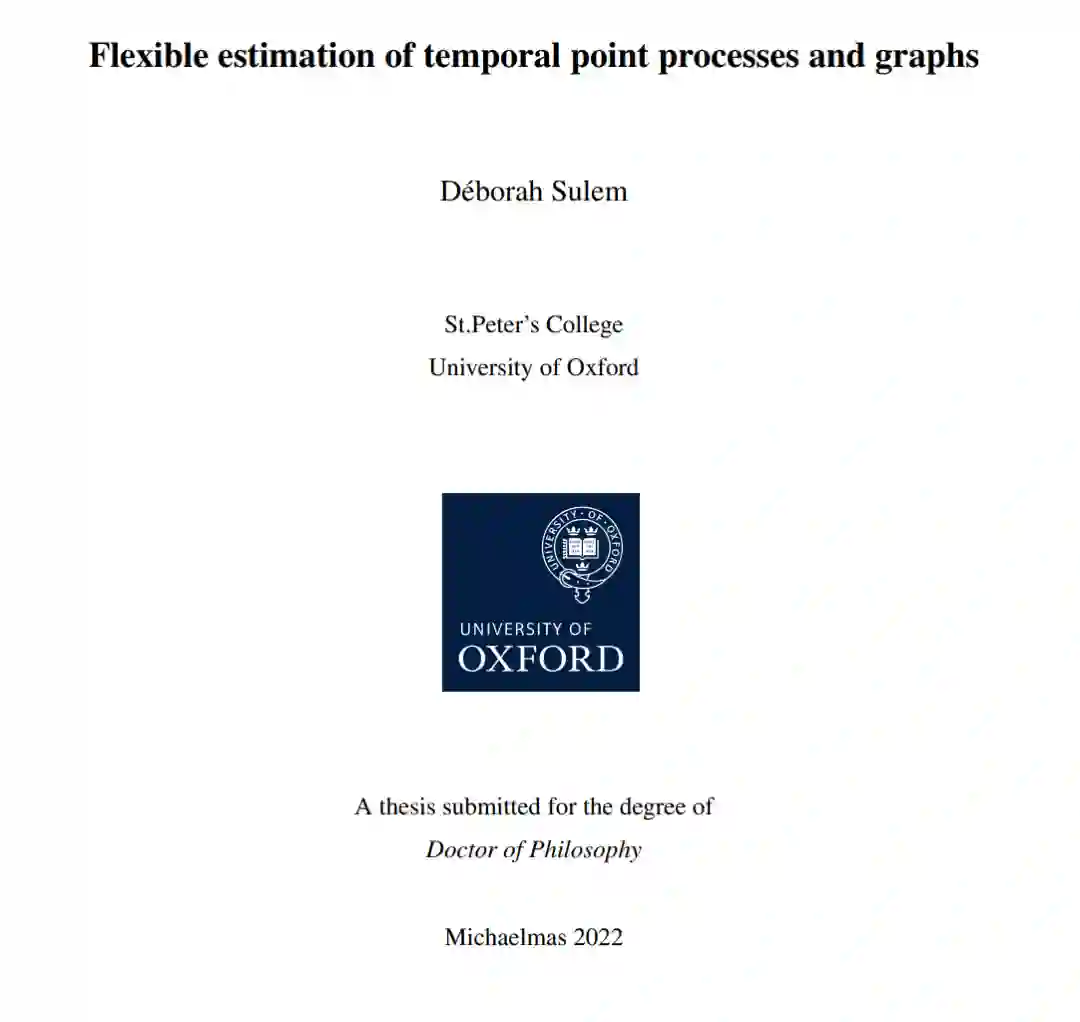 另一方面,图是由节点(或代理)和边(或链接)组成的结构,其中边表示两个节点之间的交互或关系。图无处不在,用于模拟现实世界中的社交、交通和流动网络,其中边可以对应虚拟交换、地点之间的物理连接或地理区域间的迁移。此外,图还用于表示时间序列之间的相关性和领先-滞后关系,以及随机对象之间的局部依赖性。图是典型的非欧几里得数据的示例,需要制定适当的距离度量、相似性函数和生成模型。在深度学习社区中,图在几何深度学习领域变得特别受欢迎。结构和依赖性都可以通过时间点过程和图来建模,尽管前者主要作用于时间域,而后者概念化空间交互。然而,一些统计模型结合了图和点过程,以考虑空间和时间依赖性。例如,时间点过程已被用于模拟时间图中边和节点的生成时间。此外,一些多元点过程模型具有一个潜在的图参数,用于控制过程组件之间的成对因果关系。在这篇论文中,我将特别研究这样一个模型,称为Hawkes模型,以及随时间演变的图。本论文旨在设计能够在时间点过程和图的背景下提供灵活性的推断方法。这篇手稿以综合形式呈现,包括四个主要章节和两个附录。第2章和第3章致力于研究广义Hawkes点过程模型中的贝叶斯非参数推断方法。第2章为现有方法提供理论保证,而第3章还提出、分析和评估了一种新的变分贝叶斯方法。其他主要章节介绍并研究了图上的两个估计问题的无模型推断方法,即第4章的符号图聚类问题的谱方法,以及第5章的时间图上的网络变化点检测任务的深度学习算法。此外,第1章提供了关于点过程和图的介绍和背景知识。第6章以对本手稿中的工作进行总结和批判性思考,并提出未来研究的建议来结束这篇论文。最后,附录包含两篇补充论文。第一篇位于附录A,是在2020年3月COVID-19爆发后开始的,是将离散时间的Hawkes模型应用于大流行期间第一波的与COVID-19相关的死亡统计。第二篇工作位于附录B,是在2021年于Amazon Research实习期间进行的,提出了一种用于多变量时间序列的异常检测模型的可解释性方法。