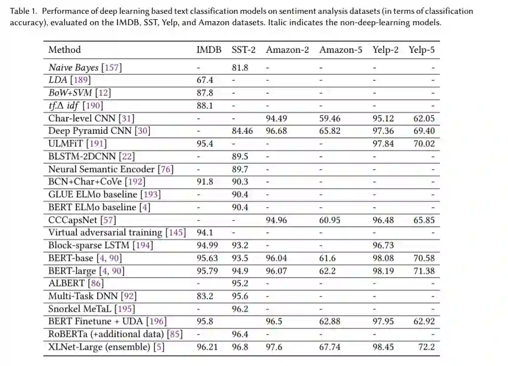 这个综述,我们回顾了在过去六年中为不同的文本分类任务开发的150多个深度学习模型,包括情感分析、新闻分类、主题分类、问答(QA)和自然语言推理(NLI)。我们根据这些作品的神经网络架构将它们分为几个类别,例如基于递归神经网络(RNNs)、卷积神经网络(CNNs)、注意力、Transformers、胶囊网等的模型。本文的贡献总结如下:
