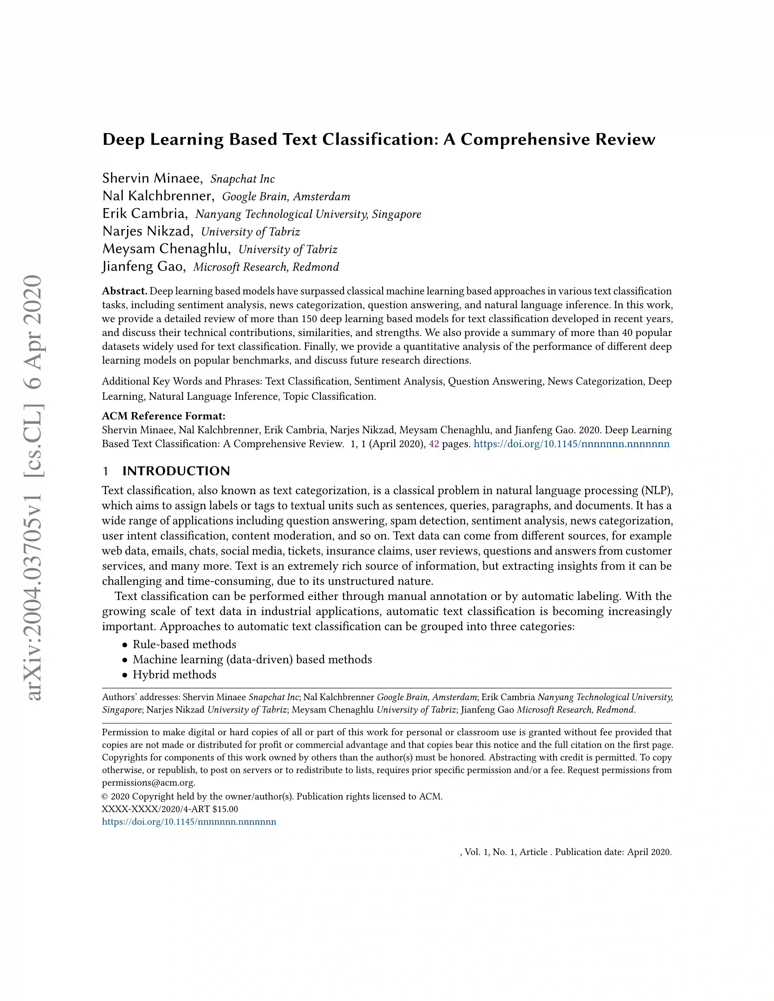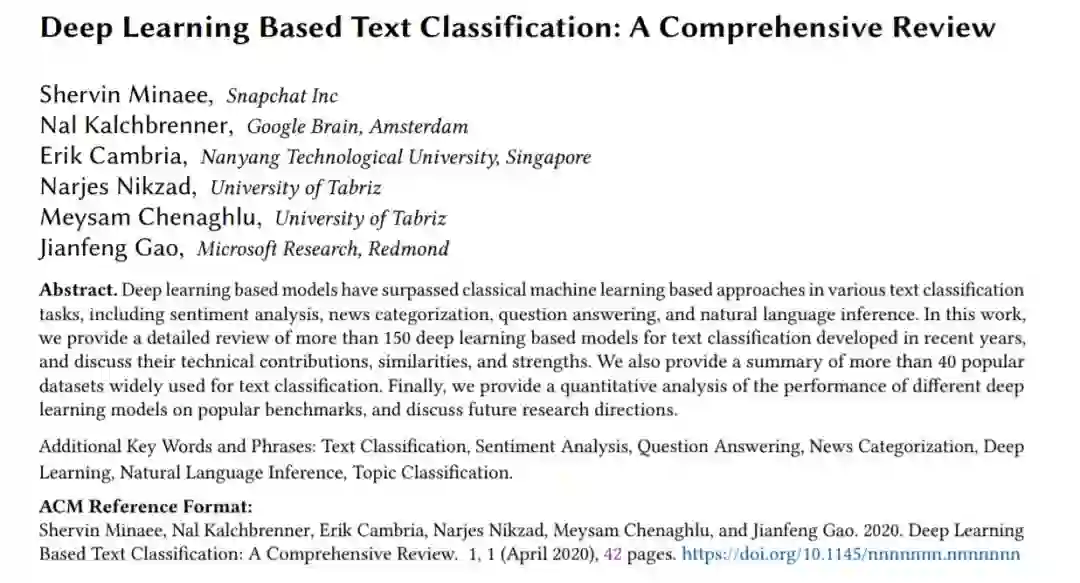 【导读】文本分类是自然语言处理汇总的基础性任务,伴随机器学习尤其是深度学习模型的发展,文本分类算法也在革新换代。最近,来自Snapchat、Google、NTU、Tabriz、微软等学者发表了关于《深度学习文本分类》的综述论文,42页pdf215篇参考文献,详细回顾了近年来发展起来的150多个基于深度学习的文本分类模型,并讨论了它们的技术贡献、相似性和优点。我们还提供了40多个广泛用于文本分类的流行数据集的摘要。