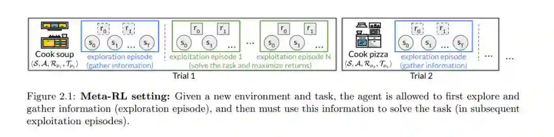 虽然在强化学习(RL)中从零开始(tabula rasa)的训练已经取得了巨大的成功,但这需要大量的数据。例如,从零开始训练以在围棋(Silver等人,2017年)、Dota 2(Berner等人,2019年)和星际争霸 II(Vinyals等人,2019年)中取得专家级的成绩,都需要数百天的TPU或GPU训练时间,相当于从常规云服务提供商那里花费数万或数十万美元。在许多应用领域,对单一任务进行如此长时间的训练,或者仅仅是获取这样的训练数据都是不切实际的——想象一下等待一百天让新闻推荐系统开始推荐好的建议,或者等待新购买的家庭机器人厨师开始烹饪。因此,这篇论文探讨了一种利用以前的经验快速学习新任务的替代范式,称为元强化学习(meta-RL)。在其核心,元强化学习试图解决与标准的从零开始的RL不同的问题。元强化学习的目标不是尝试学习一个全新的任务,而是构建可以快速适应新的,但与之前遇到的任务相关的任务的智能体,例如一个可以在新的家庭厨房中快速开始烹饪的机器人厨师,这得益于它以前的经验(例如,在许多工厂厨房中的训练)。我们主要关注典型的元强化学习环境,即智能体面临一个新任务,并首先允许有少数尝试(即,几个阶段)与任务交互,然后再被要求解决任务。例如,当被放置在一个新厨房中时,机器人厨师可能首先简要探索以寻找食材和烹饪用具,然后利用这些信息来烹制美味的饭菜。最初的几个阶段构成了智能体的“快速学习”过程,因为预计智能体在这几个阶段过后能够解决任务。
