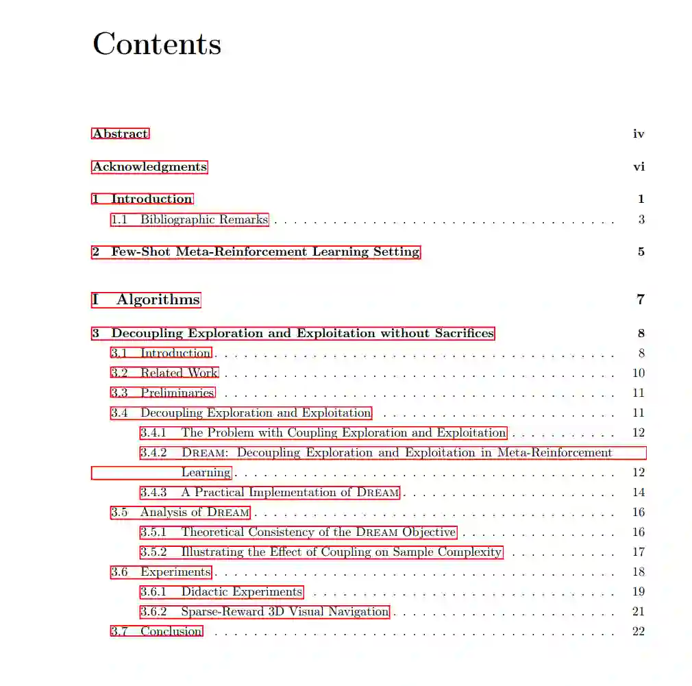 为了应对这些挑战,本文借鉴了一系列关于元强化学习的研究,始于Schmidhuber的开创性工作(Schmidhuber,1987年)。在深度RL时代的一些早期元强化学习方法(Finn等人,2017年;Houthooft等人,2018年)通过完全不针对最初的几个阶段进行优化,而是专注于构建能够在给定适当数据的情况下有效适应新任务的智能体,来避开了这些挑战。其他早期方法(Duan等人,2016年;Wang等人,2016a年)针对最初的几个阶段进行了优化,但是只是间接地从一个旨在最大化最终回报的端到端目标进行优化,对于最初的几个阶段并没有特别的关注。后来,Stadie等人(2018年)提出了一个观点,即最初的几个阶段最好用于收集信息或探索以找到高回报的区域,从而引领了一系列关于如何最好地进行这种探索的工作(Rakelly等人,2019年;Humplik等人,2019年;Zintgraf等人,2019年;Kamienny等人,2020年)。本文借鉴了Stadie等人(2018年)提出的信息收集观点,并认为在最初的几个阶段有效地进行探索并因此快速适应新任务,需要仔细地将学习探索和学习实际解决任务分离开来。具体来说,在第三章中,我们展示了将这两者结合在一起的算法遇到了一个鸡和蛋的问题,即学习探索依赖于已经学会解决任务,反之亦然。然后,我们提出了一种算法,Dream,它将这两者分离,从而在实际应用(第5章和第6章)上取得了更好的性能。