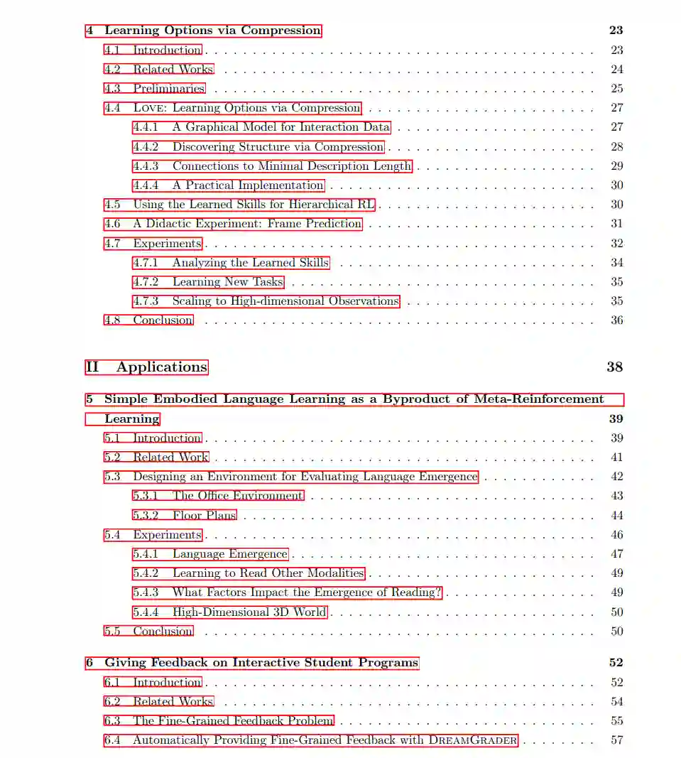 在本论文的剩余部分,我们首先在第2章中正式定义我们的少样本学习场景。然后,我们在两个主要部分中讨论快速学习新任务:在第一部分,我们讨论了快速学习新任务的算法,并克服了上述挑战,这些算法基于在智能体的少数尝试中有效地探索以揭示解决任务所需的信息(第3章),以及从离线数据中提取可复用技能(第4章)。在第二部分,我们讨论了由第一部分引入的算法所支持的两个应用,具体来说,一种新的机器语言学习范式(第5章)和自动提供初级计算机科学作业的反馈(第6章)。最后,在第7章,我们通过讨论(a)有效利用本论文中提出的元强化学习算法;以及(b)选择适合元强化学习工具箱的应用来结束。尽管元强化学习仍是一个活跃发展的领域,并且其实用性在很大程度上取决于应用的选择,但本论文的目标是为元强化学习实践者提供适用于今天实际部署的工具。