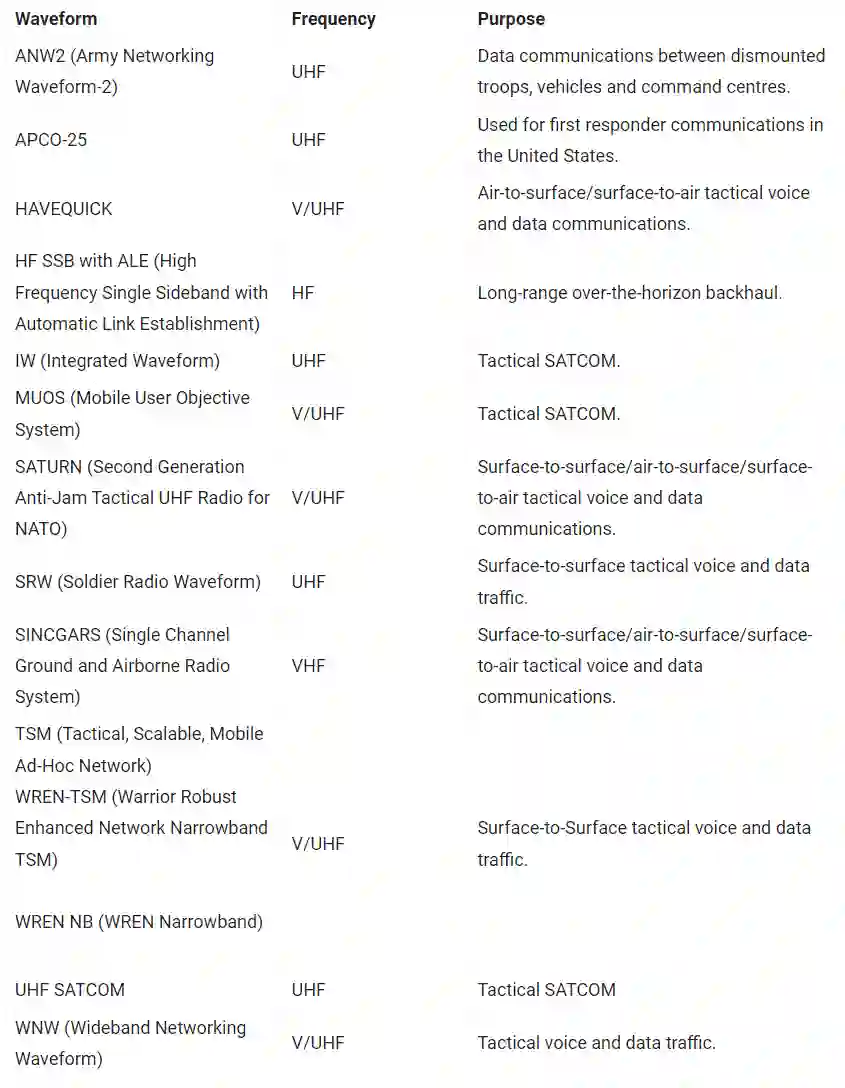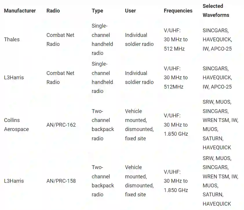 BCT 目前使用的无线电和通信网络种类繁多,可在各组成单位之间传输语音和数据流量,也可向外传输至其他编队和部门。作者在 2023 年 3 月版 ESD 上发表的 "连接兵力 "一文中详细介绍了这些系统。图 1 和图 2 详细介绍了 BCT 使用的无线电、其传输的波形及其用途。