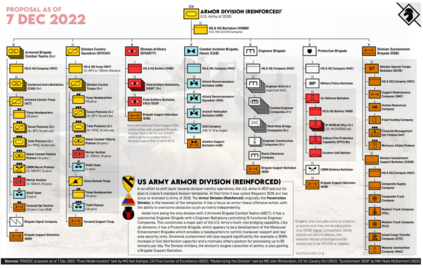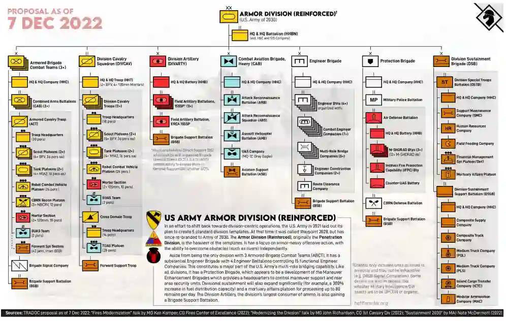 图:美国陆军已就其未来师团的面貌起草了若干建议。这幅示意图展示了一个加强装甲师的潜在战斗序列。与目前的旅级战斗队相比,这种编队的规模显然要大得多。资料来源:美国陆军