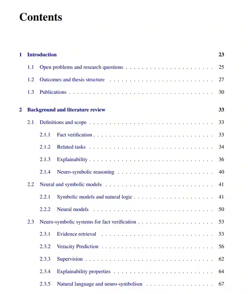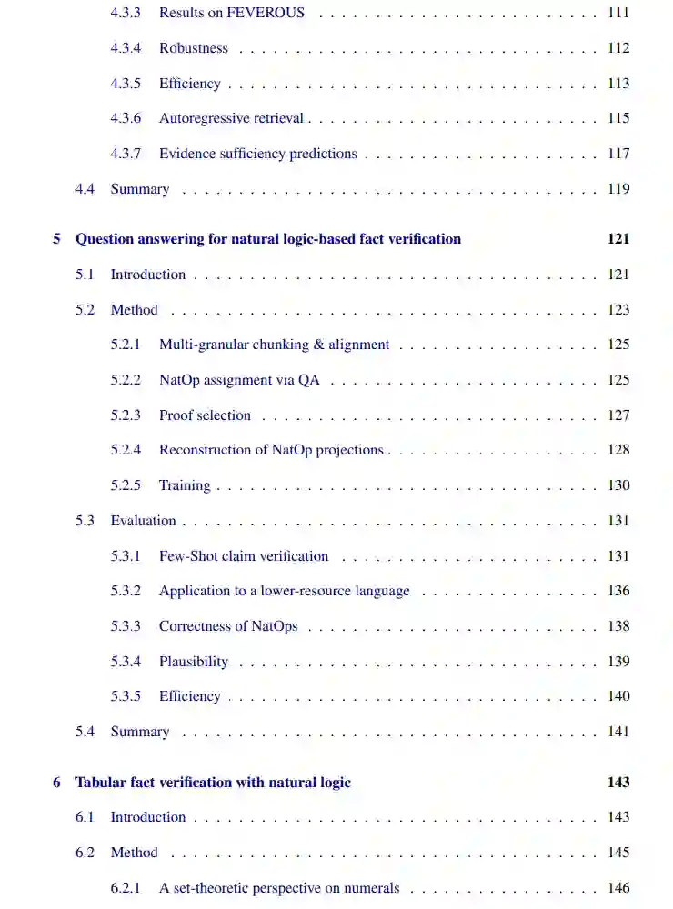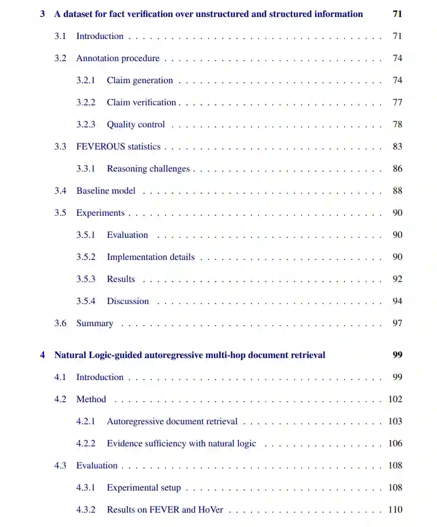 事实核查(Fact-checking)是评估主张真实性的过程,通常十分耗时,可能需要数小时甚至数天来验证一个主张,因此推动了自动化事实核查(或部分自动化)计算方法的发展。该挑战在自然语言处理领域中被具体化为事实验证(fact verification)任务,通常通过从知识源中提取文本证据并利用神经蕴含系统对主张的真实性进行推理来建模。 然而,这类系统的推理过程本质上不透明,存在鲁棒性问题,并且难以捕捉诸如单调性等形式良好的语义概念。 为了解决这些问题,本论文探索了用于事实验证的神经-符号方法(neuro-symbolic methods),将符号系统与神经表示相结合。我们特别关注自然逻辑(natural logic)这一组合性蕴含推理框架,它直接作用于自然语言,通过捕捉主张和文本证据之间的集合论关系进行推理。作为一个旨在通过确定性推理识别有效推断的逻辑系统,自然逻辑特别适用于事实验证任务,其中主张需由证据蕴含(entail),同时能够保障诸如忠实性(faithfulness)和可执行性(actionability)等可解释性属性。 本论文的首个贡献是构建了 FEVEROUS数据集,这是一个大规模数据集,要求对检索到的文本和表格证据进行复杂推理(如算术推理或多跳推理),以推动神经-符号方法的发展。 随后,我们探索了将自然逻辑作为符号推理框架与自回归语言建模的最新进展相结合的方式,以提升事实验证系统的可解释性、鲁棒性和泛化能力。我们提出了如下系统: 1. 将自然逻辑作为自回归多跳文档检索的动态且透明的停止准则; 1. 消除训练自然逻辑推理系统对大规模标注数据的依赖; 1. 将自然逻辑扩展至表格证据与算术运算,以应对复杂主张验证中的关键挑战。