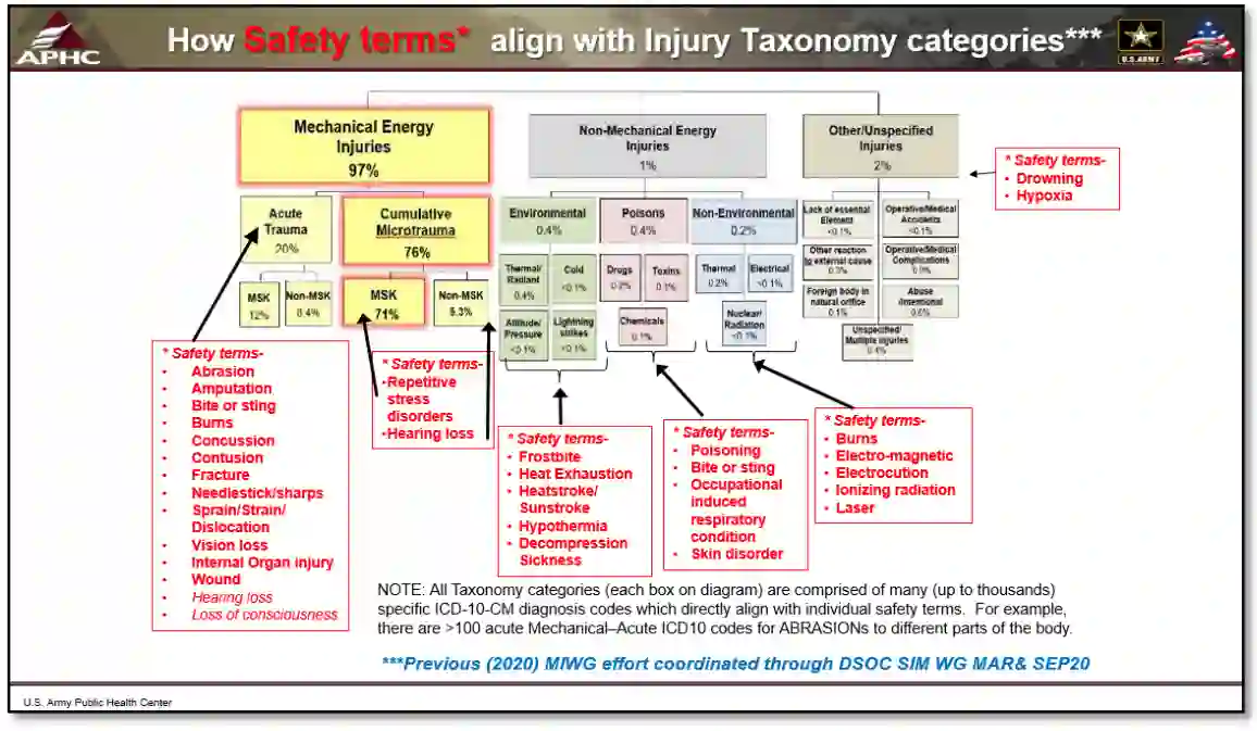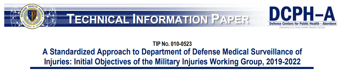 美国国防安全与监督委员会(DSOC)军事伤害工作组(MIWG)成立于 2019 年,其部分目标是建立统一的国防部(Department of Defense,DoD)伤害定义,创建标准化的医疗伤害监测报告工具,并探讨军种层面的伤害问题,以提出改进伤害报告的国防部解决方案。本文件反映了在美国陆军公共卫生中心(APHC)(现名为国防公共卫生中心-阿伯丁(DCPH-A))公共卫生科学家主持下,MIWG 在 2019 至 2022 日历年间所做的初步工作。