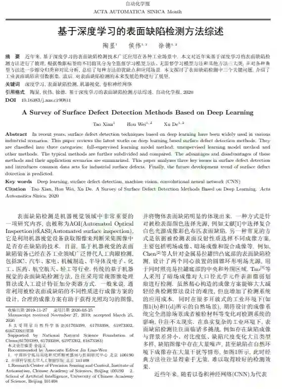 摘要:近年来,基于深度学习的表面缺陷检测技术广泛应用在各种工业场景中.本文对近年来基于深度学习的表面缺陷检测方法进行了梳理,根据数据标签的不同将其分为全监督学习模型方法、无监督学习模型方法和其他方法三大类,并对各种典型方法进一步细分归类和对比分析,总结了每种方法的优缺点和应用场景.本文探讨了表面缺陷检测中三个关键问题,介绍了工业表面缺陷常用数据集.最后,对表面缺陷检测的未来发展趋势进行了展望.