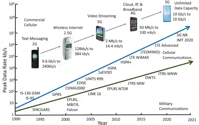 我们合理解释了军事通信技术中峰值数据速率的下降趋势。