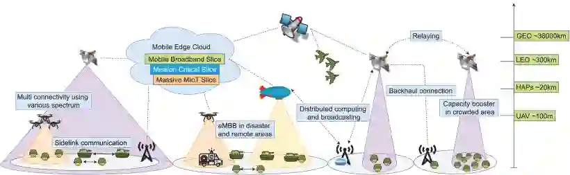 1)商业蜂窝连接依赖于组织完善且安全的基础设施,而另一方面,军事部门可能需要在没有此类基础设施的地区进行连接。此外,通信网络大多受到恶劣天气和多变地形的影响。海上、空中和敌方领域的军事通信不能依赖永久性基础设施,也不能配备固定基站(BS)。此外,军事通信网络对广域覆盖和海、陆、空、天多域连接的需求也没有得到商业网络的充分考虑。