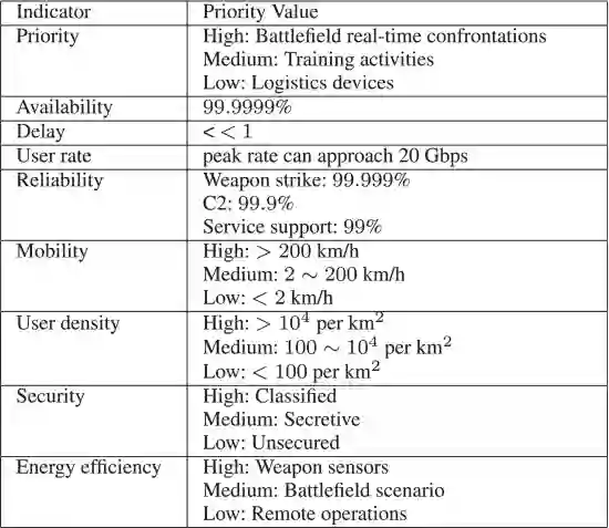 军事任务既包括基本通信服务,如消息、数据、语音和视频,也包括关键服务通信,如作战设备、车辆、机器人等触觉操作中的 C2 通信。因此,应根据军事任务的重要性确定网络资源调度的优先级。而且,必须根据任务进展或作战情况实时动态地改变优先级。军事通信可分为高、中、低三类,分别用于战争实时对抗活动、训练活动和后勤装备保障任务。