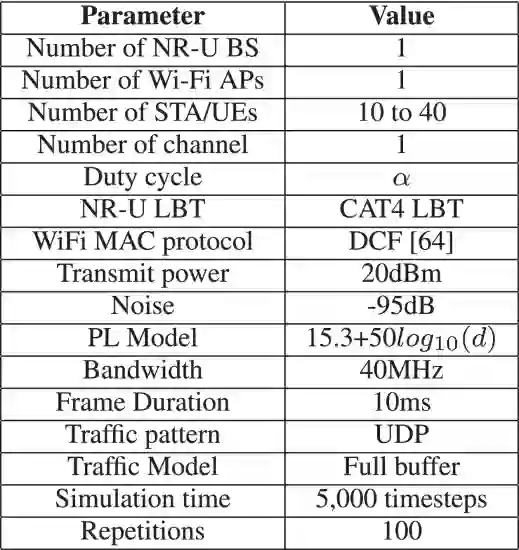 在本研究中,我们考虑的部署场景是军方覆盖一个有限的地理区域,如文献 [59] 所述,该地理区域被进一步划分为三个部分:雷达区、专属区和后勤区。后勤区由其覆盖范围周围的多个 NR-U 小区组成。在评估中,我们采用了单个 NR-U 小区,其性能可复制到其他 NR-U 小区。我们使用 MATLAB 开发了一个系统级仿真平台。NR-U BS 在 3.5 GHz 信道中支持的 NR-U 用户数量和其他网络参数如表 7 所示。在同一信道中,Wi-Fi AP 和 Wi-Fi 站与 NR-U 服务共存。NR-U 用户和 Wi-Fi 站在小区覆盖范围内任意分布。在 Wi-Fi 网络中,所有 STA 都利用一种称为分布式协调功能(DCF)协议的载波感知方案来争夺信道接入权,而 NR-U BS 则采用 ETSI 支持的 LBT 类别 4(用于 FBE 方法)[60] 或占空比基础方法(在适当的持续时间内自适应地占用共享信道)。