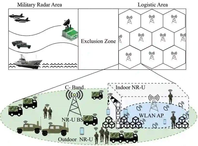 海军雷达使用的 C 波段(3.55-3.7GHz)可视为实现军用 5GB 专用蜂窝系统的关键频段之一 [54],[55]。这是因为这些频段利用率极低,雷达占用率每年仅为 9% 到 25% [56]。此外,这些频段存在于有限的地理区域;因此,通过实用的保护距离和严格的干扰保护机制,可以建立与现有海军雷达共存的二级 5GB 军事通信系统。在此背景下,我们提出了 5GB NR-U 技术(3GPP Rel-16),作为军事通信系统的一种有吸引力的方法。NR-U 源自已被广泛接受的 LTE-U/LAA 方法,其中对 LTE 协议栈进行了调整,以协助与雷达和 Wi-Fi 等其他技术共存 [57]、[58]。此外,对 LTE 协议栈的此类更改可显著减少雷达所需的投射距离,从而增加信道中的频谱接入机会。例如,NR-U gNB 可感知雷达旋转模式,并相应调整其占空比(开-关持续时间),使其传输不与正在进行的雷达传输重叠。此外,NR-U 还支持公平共存,在这种情况下,Wi-Fi 服务受到的影响不会超过同一载波上的额外 Wi-Fi 网络。因此,如图 6 所示,NR-U 与传统的 Wi-Fi 或新的 Wi-Fi 连接可以很容易地为多样化和密集的军事后勤环境进行设置。