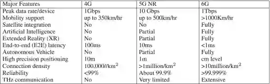 表 4 4G、5G 和 6G 蜂窝通信的比较 [18]