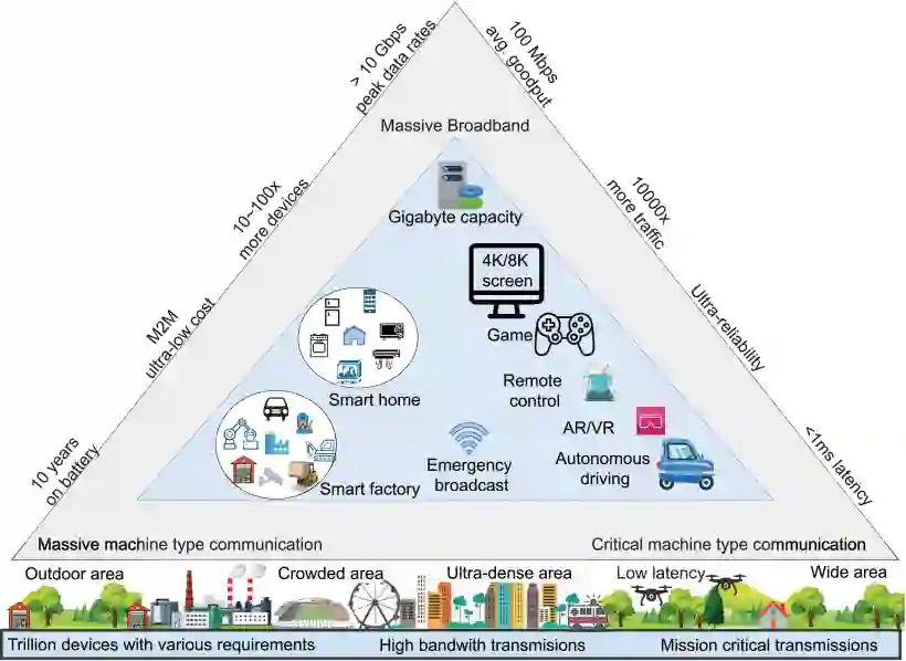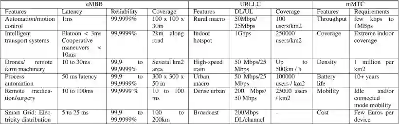 一般来说,5GB 应用分为三类:增强型移动宽带(eMBB)、海量机器类型通信(mMTC)和超可靠低延迟通信(URLLC)。首先,也是最重要的先决条件是 eMBB,它是 4G/LTE 向 5GB 发展的必然趋势,可支持浏览速度提高 10 倍,即目标浏览速度将从每秒 1 千兆比特开始,下载速度将超过每秒 200 兆比特。其次,开发 mMTC 是实现物联网(IoT)目标的必要条件,即实现日常智能小工具、汽车和工业设备的互联。最后,URLLC 是 "关键任务 "应用的有用应用,这些应用需要实时收集数据,以便了解态势和快速决策。图 3 描述了商用 5G 的三个类别及其目标应用和一般用例。此外,不同场景对各种应用的要求也不尽相同,因此我们在表 5 中描述了基于不同场景的 5G 应用的关键性能要求。
