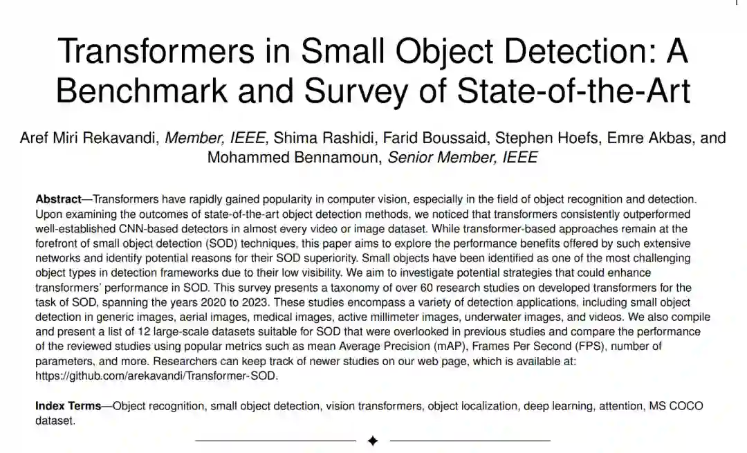 Transformer在计算机视觉领域迅速普及,特别是在目标识别和检测领域。在检查了最先进的目标检测方法的结果后,我们注意到Transformer在几乎每个视频或图像数据集上的表现都优于成熟的基于CNN的检测器。虽然基于Transformer的方法仍然处于小目标检测(SOD)技术的前沿,但本文旨在探索这种广泛的网络提供的性能优势,并确定其SOD优势的潜在原因。由于小目标的低可见性,小目标已被确定为检测框架中最具挑战性的对象类型之一。我们旨在研究可能提高Transformer在SOD中性能的潜在策略。这项综述提出了一个关于已开发的Transformer的SOD任务的60多项研究的分类,跨越2020年至2023年。这些研究涵盖了各种检测应用,包括通用图像、航拍图像、医学图像、主动毫米图像、水下图像和视频中的小目标检测。我们还编译并列出了12个适合SOD的大规模数据集的列表,这些数据集在以前的研究中被忽视了,并使用流行的度量标准(如平均平均精度(mAP)、每秒帧数(FPS)、参数数量等)比较了所评述的研究的性能。