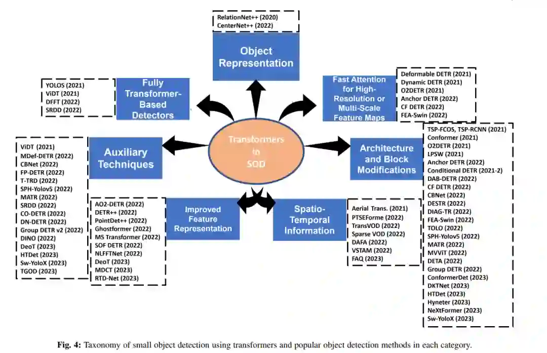 在我们之前的工作中,我们调查了许多在深度学习中使用的策略,以提高光学图像和视频中小目标检测的性能,直至2022年[11]。我们表明,除了适应新的深度学习结构(如Transformer)外,流行的方法包括数据增强、超分辨率、多尺度特征学习、上下文学习、基于注意力的学习、区域建议、损失函数正则化、利用辅助任务和时空特征聚合。此外,我们观察到Transformer是大多数数据集中定位小目标的主要方法之一。然而,鉴于[11]主要评估了超过160篇专注于基于CNN的网络的论文,没有对以Transformer为中心的方法进行深入探索。认识到该领域的增长和探索步伐,现在有一个及时的窗口来深入研究当前面向小目标检测的Transformer模型。本文的目标是全面了解在应用于小目标检测时,变换器令人印象深刻的性能的贡献因素,以及它们与用于通用目标检测的策略的区别。为了奠定基础,我们首先强调了著名的基于Transformer的SOD目标检测器,并将其与基于CNN的方法的进步进行比较。