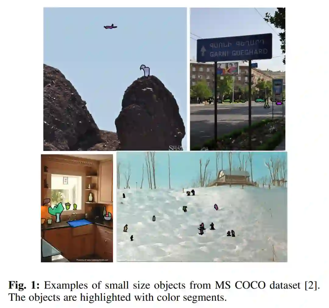 小目标检测(SOD)已被认为是当前最先进的目标检测方法(SOTA)面临的一个重大挑战[1]。“小目标”指的是占据输入图像一小部分的物体。例如,在广泛使用的MS COCO数据集[2]中,它定义了在典型的480 × 640图像中边框为32 × 32像素或更小的物体(图1)。其他数据集也有自己的定义,例如占据图像10%的物体。小目标经常被遗漏或检测到错误的边框,有时还有错误的标签。SOD中定位不足的主要原因是输入图像或视频帧中提供的信息有限,加剧了它们在深度网络中通过多个层时所经历的空间退化。由于小目标经常出现在各种应用领域,如行人检测[3]、医学图像分析[4]、人脸识别[5]、交通标志检测[6]、交通灯检测[7]、船舶检测[8]、基于合成孔径雷达(SAR)的目标检测[9],因此值得研究现代深度学习SOD技术的性能。本文比较了基于Transformer的检测器和基于卷积神经网络(CNN)的检测器在小目标检测方面的性能。在明显优于CNN的情况下,我们试图揭示Transformer强大性能背后的原因。一个直接的解释可能是Transformer对输入图像中成对位置之间的相互作用进行了建模。这是一种有效的上下文编码方式。而且,众所周知,上下文是人类和计算模型检测和识别小目标的主要信息来源[10]。然而,这可能不是解释Transformer成功的唯一因素。具体而言,我们的目标是沿着几个维度分析这种成功,包括对象表示、高分辨率或多尺度特征图的快速注意力、完全基于Transformer的检测、架构和块修改、辅助技术、改进的特征表示和时空信息。此外,我们指出了可能增强Transformer在SOD中性能的方法。