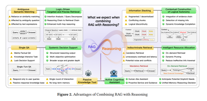 将推理与RAG结合解决了传统RAG系统的局限性,这些系统由于依赖于表面语义匹配和固定的知识边界,在多步逻辑、上下文适应和隐性知识合成方面表现不佳。增加推理能力使得动态检索规划成为可能,能够对证据进行逻辑验证,并通过溯因推理或反事实推理生成超越检索数据的洞见。同时,外部知识检索的引入有助于缓解LRM知识限制所造成的推理中断,减少幻觉的可能性。这种集成方式主要有两种形式:推理增强检索,即推理驱动上下文感知的信息收集;检索增强推理,即外部知识支持并扩展模型的演绎能力。