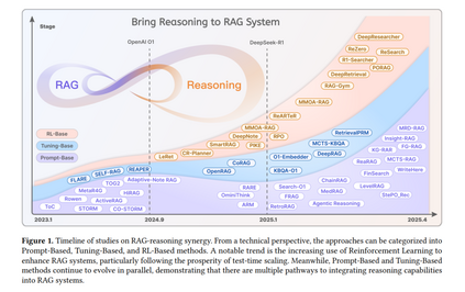 最近,像OpenAI O1 [39] 和DeepSeek-R1 [25] 等大型语言模型(LLMs)在推理能力方面的突破,已将范式从“预训练扩展”转变为“测试时扩展”[63]。与传统的语言模型通过在预训练期间累积语料来提高性能不同,这些模型通过推理阶段的后期训练创新(例如,Long-CoT思维[8])提升了在复杂任务中的表现——如数学推导和代码生成[29]。这一转变催生了“大型推理模型”(LRMs)[99],这些模型具有先进的内部推理能力。这些进展不仅提升了基本模型的能力,还为检索增强生成(RAG)[21] 等应用技术开辟了新的前景。作为语言模型与外部知识之间的关键纽带,RAG通过实时检索非参数化信息并将其融入上下文,克服了传统LLMs在知识新鲜性、领域特异性和事实准确性方面的局限。这增强了信息处理,并减少了在知识密集型任务中的幻觉风险。 随着技术进步,RAG架构通过查询重写[61]、重排序[1]和混合检索[88]等创新不断发展,创建了一个专注于预检索优化和后检索精炼的先进RAG范式。模块化RAG [22] 进一步将这些系统细分为基于组件的、面向服务的架构,通过编排来解决实际挑战。尽管在查询意图识别和知识使用方面有所改善,但RAG在深度研究和复杂决策等高要求任务中仍面临挑战。关键问题包括:1)从模糊查询中捕捉意图的困难;2)多跳推理中的逻辑连贯性差;3)传统检索在开放域中的效率限制;以及4)从噪声检索数据中生成质量下降。 像DeepSeek-R1等具有强大推理能力的模型,为RAG系统开辟了新的方向。如图1所示,最近的研究探索了将形式化推理框架与知识检索相结合的方法。这种方法通过逻辑驱动的查询重构来优化检索,并利用推理分析和验证检索的知识,在检索与生成之间创造认知协同作用。该范式旨在克服传统的局限,打造具有严格逻辑和可靠知识使用的智能系统。从趋势角度看,越来越多的方法通过强化学习(RL)结合推理与检索能力,标志着LRM时代的新方向。与此同时,基于提示的方法持续快速发展,研究人员通过工作流设计来实现结果,同时保持模型参数冻结。值得注意的是,单一依赖调优方法的情况正在逐步减少,这表明在这一阶段,额外微调带来的改进有限。 传统RAG受到其单向流(检索→生成)的限制。通过集成推理能力,系统获得了更大的自主性,解锁了新的可能性。如图2所示,这种集成有望推动重大突破,使其能够在复杂的现实场景中得到实际应用。 1)从模糊语义匹配到逻辑驱动的目标化检索。传统RAG依赖于语义相似度进行检索;然而,它对措辞变化很敏感。先进的推理允许对查询进行深度逻辑分析(例如,因果关系、条件约束),以动态地优化检索策略[24]。例如,回答“如何降低糖尿病患者的术后感染风险?”时,系统优先检索“血糖控制阈值”和“抗生素使用指南”,而不是简单地匹配“糖尿病术后护理”。这种方法支持多跳检索,通过推理链保持跨文档的连贯性,同时将复杂查询分解为顺序子查询。 2)从简单的信息汇聚到逻辑连贯的上下文构建。当前的RAG系统将所有检索到的文档块直接输入上下文,这往往导致碎片化或矛盾的信息,使LLMs困惑。增强推理的系统通过逻辑验证和推断检索内容中的因果关系,整合证据链,过滤冲突并形成连贯的解释[100]。它们还利用动态知识补全来检测缺失的逻辑链接,提示进行迭代检索或推理来填补空白[51]。 3)从简单的单轮问答到系统性的决策支持。传统RAG在事实问答[65]中表现良好,但在多步和复杂决策中表现较差。集成推理的系统能够生成结构化的推理输出,增强多目标优化,在各种约束下平衡检索的广度和解决方案的可行性。例如,在工程建设方案中,不同条件下的多重约束[54],以及医疗领域中各种疾病的诊断和治疗方案的制定[105]。 4)从不加区分的检索到智能资源分配。传统RAG为所有查询进行检索,无论其复杂性如何。增强推理的系统采用按需检索,简单查询通过直接生成处理,复杂查询通过多轮检索来减少延迟[20]。动态检索修剪使用预推理预测来定位关键信息,最小化不必要的文档和图形遍历[41]。 5)从被动知识工具到主动认知助手。超越反应式知识检索,增强推理的系统能够通过提问澄清问题并预测隐含需求,主动为用户服务。这种转变使得集成记忆、推理和决策的类人助手成为可能,对于深度研究[43]、商业分析[50]、个人助手[107]和城市规划[85]等复杂任务尤其有价值。 然而,RAG与推理之间的协同路径不仅仅是简单地用LRM模块替代传统生成型LLMs。它需要深入整合来自LRM的技术演化洞察——通过重构知识检索机制和强化推理-生成的协同链接——从而在RAG架构中实现系统级的认知能力提升。 因此,本文旨在解决“RAG系统如何与推理能力协同工作”的关键前瞻性研究问题。我们对2024年之后的相关研究进行了系统综述,并明确界定了RAG语境中的推理定义。在此基础上,我们提供了一个深入的分类体系和分析,揭示RAG-推理集成的目标、典型模式和实现方式,阐明关键技术轨迹和突破点。 随着RAG技术进入下一个发展阶段,下游任务的复杂性显著增加——特别是在深度研究等新兴挑战中尤为明显[106]。这些先进的应用不仅要求提升推理能力,还推动RAG向多模态、跨领域和动态环境扩展。然而,尽管推理能力的集成显著提高了复杂任务的表现,现有研究往往忽视了与之相关的计算开销和潜在风险。通过系统地检视这些操作约束并分析行业应用,