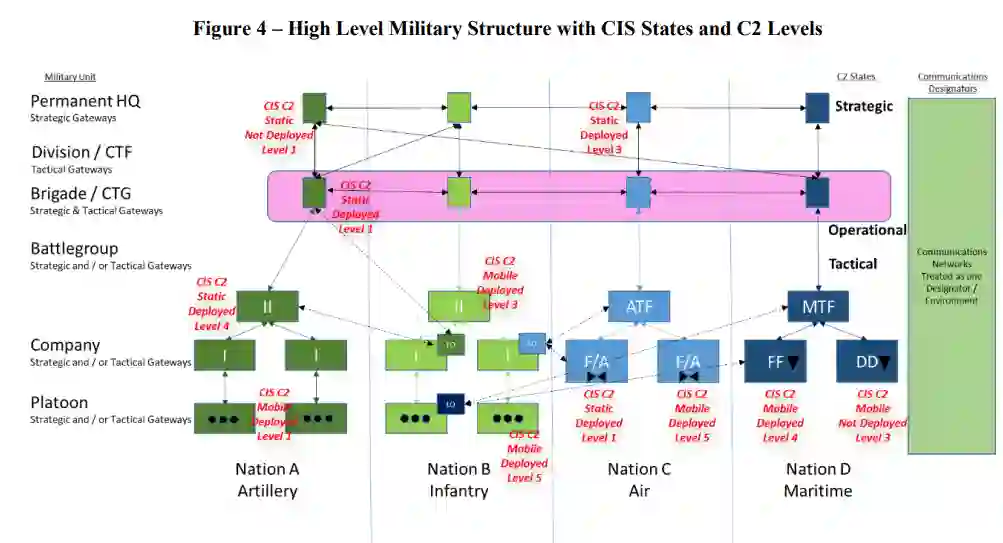 目前的军事条令 AJP6 将通信网络定义为战略或战术网络。这些网络支持战略、作战和战术指挥系统。一般用户认为,在战略、作战和战术层面有 3 个网络类别,用于支持指挥、作战或在该层面连接的通信信息系统(CIS),即(OpCIS)和战术 CIS(TacCIS);提供这些网络是为了支持这三种指挥环境。这与通信信息交换需求(IER)相辅相成,而通信信息交换需求历来是根据战斗序列和指挥结构,以从战略到战术的分级方式分配的,越接近战术边缘,支持分级信息/数据流的能力和吞吐量理论上就越小。然而,由于必要性、机遇和不断发展的技术,所设计的战略 CIS 系统和网关可在战术层面使用或访问,并可直接进行跨网络通信。