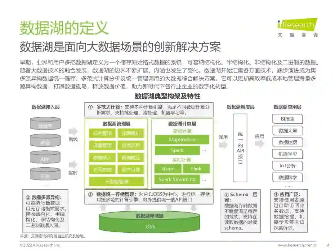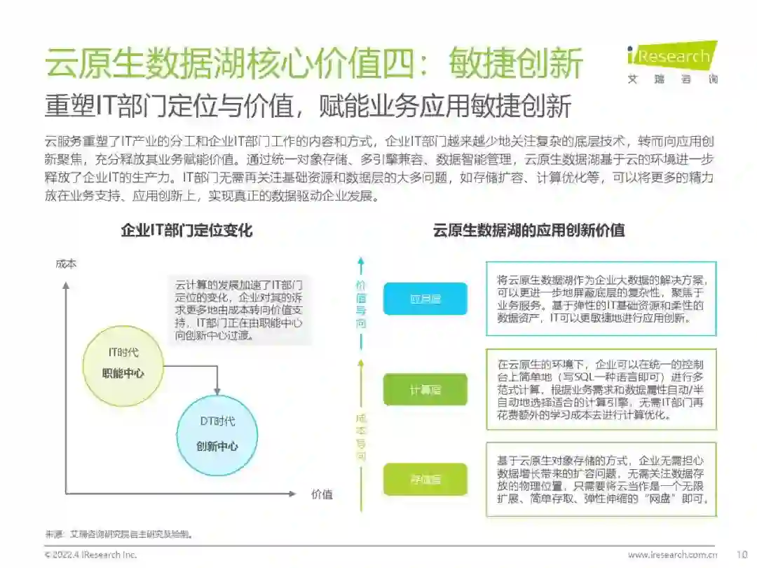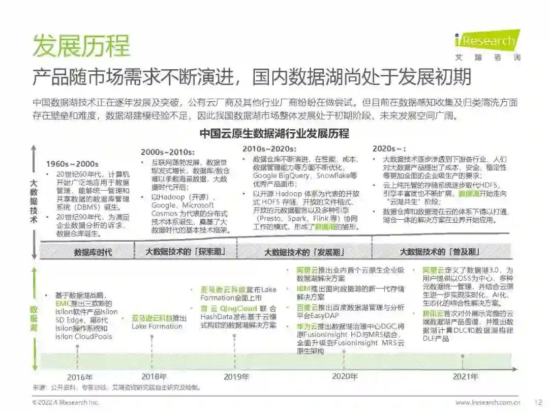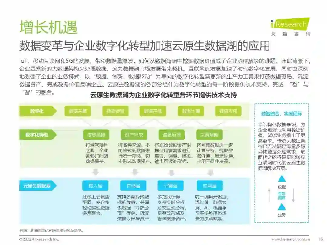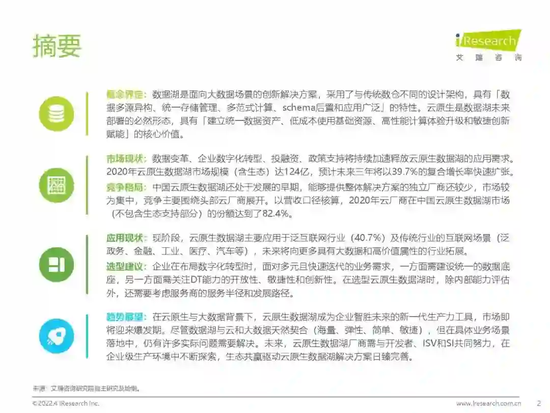 概念界定:数据湖是面向大数据场景的创新解决方案,云原生是数据湖未来部署的必然形态,具有「建立统一数据资产、低成本使用基础资源、高性能计算体验升级和敏捷创新赋能」的核心价值。 市场现状:2020年云原生数据湖市场规模(含生态)达124亿,预计未来三年将以39.7%的复合增长率快速扩张。 竞争格局:中国云原生数据湖还处于发展的早期,能够提供整体解决方案的独立厂商还较少,市场较为集中,竞争主要围绕头部云厂商展开。 应用现状:现阶段,云原生数据湖主要应用于泛互联网行业(40.7%)及传统行业的互联网场景(泛政务、金融、工业、医疗、汽车等),未来将向更多具有大数据和高价值属性的行业拓展。 选型建议:企业在布局数字化转型时,面对多元且快速迭代的业务需求,一方面需建设统一的数据底座,另一方面需关注DT能力的开放性、敏捷性和创新性。在选型云原生数据湖时,除内部能力评估外,还需要考虑服务商的服务半径和发展路径。 趋势展望:在云原生与大数据背景下,云原生数据湖成为企业智胜未来的新一代生产力工具,市场即将迎来爆发期。未来,云原生数据湖厂商需与开发者、ISV和SI共同努力,在企业级生产环境中不断探索,生态共赢驱动云原生数据湖解决方案日臻完善。