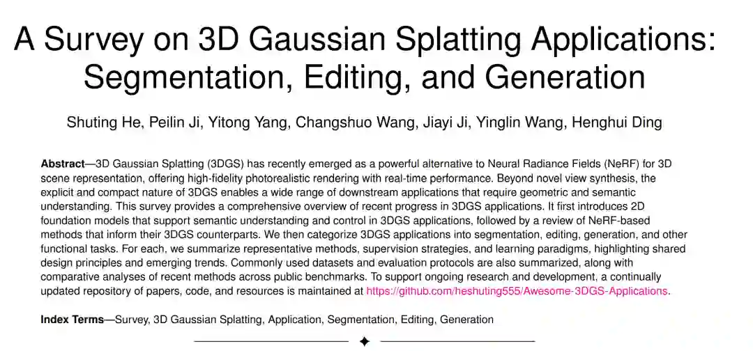 摘要—三维高斯泼溅(3D Gaussian Splatting,3DGS)近期已成为神经辐射场(Neural Radiance Fields,NeRF)在三维场景表示中的一种有力替代方案,能够在保持高保真、逼真渲染的同时实现实时性能。除了新视角合成之外,3DGS 显式且紧凑的特性还支持多种需要几何与语义理解的下游应用。本文对 3DGS 应用的最新进展进行了全面综述。首先介绍了支持 3DGS 应用中语义理解与控制的二维基础模型,然后回顾了对 3DGS 方法具有启发意义的基于 NeRF 的相关方法。随后,我们将 3DGS 应用划分为分割、编辑、生成以及其他功能性任务,并针对每一类,总结了具有代表性的方法、监督策略与学习范式,重点分析其共性设计原则与新兴发展趋势。文中还汇总了常用的数据集与评测协议,并在公共基准上对近期方法进行了对比分析。为支持持续的研究与开发,我们在 https://github.com/heshuting555/Awesome-3DGS-Applications 维护了一个持续更新的论文、代码与资源仓库。 关键词—综述,三维高斯泼溅,应用,分割,编辑,生成