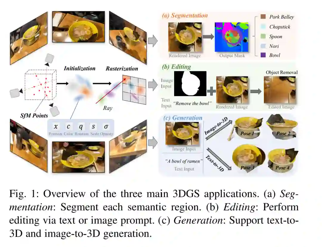 贡献 本文系统而全面地回顾了近期 3DGS 文献,重点关注其新兴的下游应用。我们首先介绍能够在基于 3DGS 的系统中实现语义控制与理解的二维基础模型,并简要回顾相关的 NeRF 方法以建立概念上的连续性。本文的核心部分围绕三大主要任务类别展开:分割、编辑与生成。在每一类别中,我们从技术设计、学习范式与监督策略等方面系统比较了具有代表性的研究,并进一步分析了各领域的基准设置与性能表现,旨在为新入门者与资深研究人员提供一份自洽且易于查阅的参考资源。最后,我们讨论了开放挑战与未来研究机遇,旨在推动 3DGS 在高层视觉与图形应用任务中的深入探索与广泛应用。