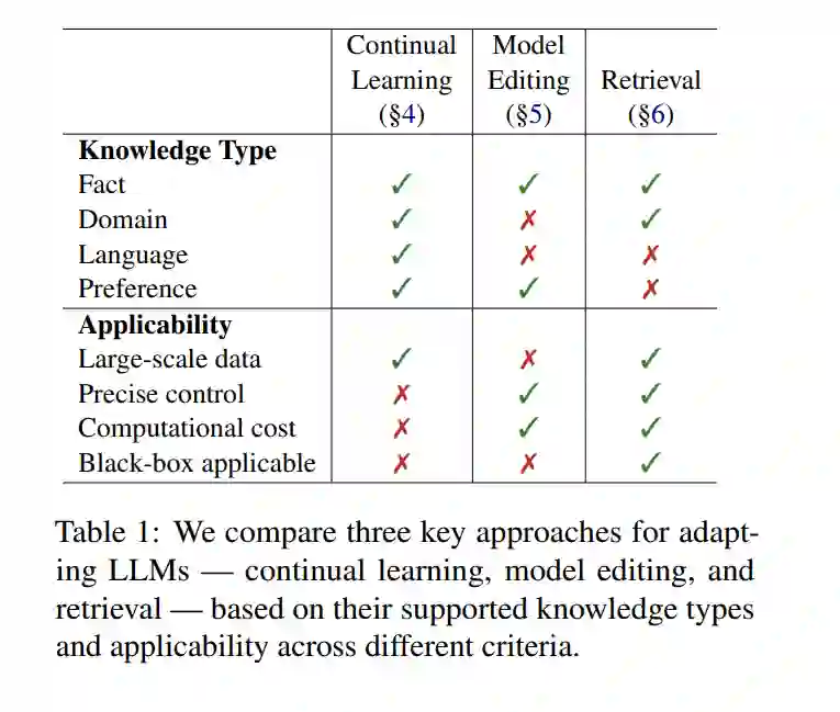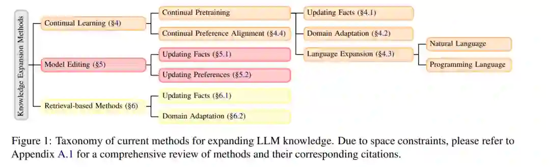 随着大型语言模型(LLM)在实际应用中的逐渐普及,它们适应不断变化的知识的能力对于保持相关性和准确性变得至关重要。然而,LLM 通常只进行一次训练,因此它们的知识更新仅限于某个截止日期,限制了它们与新信息保持同步的能力。本综述全面概述了使 LLM 能够整合各种类型新知识的方法,包括事实知识、领域特定知识、语言知识和用户偏好知识。我们调查了适应策略,包括持续学习、模型编辑和基于检索的方法,并旨在为研究人员和实践者提供指导。 为了保持有效性,LLM 需要在多个维度上进行更新。事实知识包括一般真理和实时信息,而领域知识则涉及特定领域,如医学或法律。语言知识增强了多语言能力,偏好知识使模型的行为与用户的期望和价值观保持一致。确保 LLM 能够在这些维度上整合更新对于其持续的实用性至关重要。 现有的 LLM 适应方法在方法和应用上有所不同。持续学习使得模型的参数化知识能够进行增量更新,减轻灾难性遗忘(McCloskey 和 Cohen,1989),同时确保长期表现。模型编辑允许精确修改已学习的知识,提供受控的更新,而不需要完全重新训练。与这些隐式知识扩展方法不同,基于检索的方法在推理过程中显式地动态访问外部信息,从而减少对静态参数化知识的依赖。不同知识类型的这些方法的适用性和一般性已在表 1 中总结。通过利用这些策略,LLM 可以保持准确性、上下文意识,并适应新信息。 在第二节中,我们将我们的工作置于背景中(第 2 节),并在第三节中定义本文涉及的知识类型。我们还概述了不同的知识扩展方法,如图 1 所示。因此,本工作综述了多种研究努力,并可作为研究人员和实践者开发和应用可适应且强大的 LLM 的指南。我们强调了研究机会,并提供了优化适应技术以应对各种实际应用的见解。