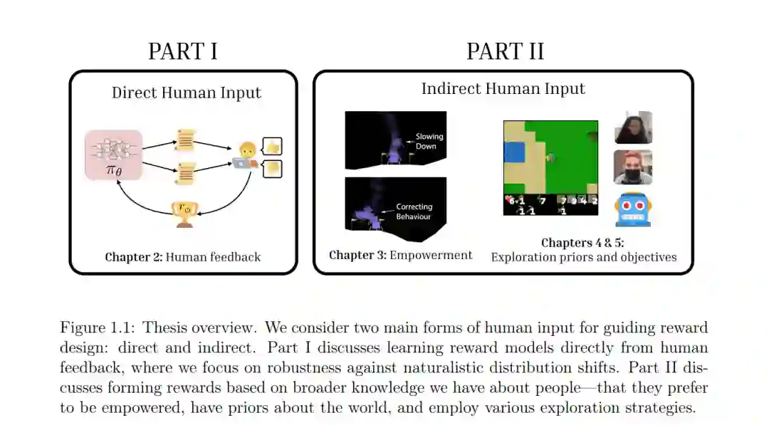 具体来说,第2章首先介绍了从不同形式的聚合人类反馈中学习奖励模型的一般设置。在这个领域,我们展示了我们的工作,即通过重新构思奖励建模问题,使其适应于大规模、预训练的视觉-语言模型,从而为高维输入开发更具泛化性的奖励模型。在这里,我们展示了对于语言和视觉分布变化的增强鲁棒性。这使我们能够将多模态奖励模型扩展到丰富的、真实世界的设置中,在那里可以有许多不同的方式来完成相同的基础任务或目标。接下来,我们询问:我们能否基于我们对人类的一般知识设计奖励?