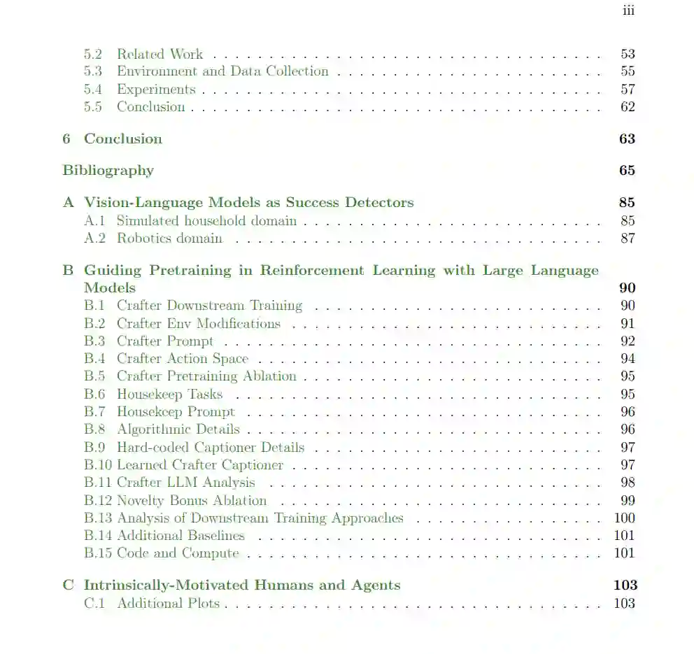 虽然先前的工作提出了用于RL代理探索的内在奖励函数,但这些内在奖励通常旨在无差别地最大化多样性。因此,它们无法很好地适应真实世界探索的复杂性,其中可以有无限多样和有趣的状态。另一方面,人类能够以一种由丰富的先验知识以及一些内在目标指导的方式探索新环境。第4章提出了用丰富的人类先验知识指导探索,这些知识被提炼到大型语言模型中。这使我们能够通过利用对有意义行为的先验知识进行开放式环境的探索,这些行为是常识性的并且对上下文敏感。第5章介绍了我们对比人类和代理在开放式环境中探索行为的工作。最后,在第6章中,我们反思所学到的经验教训,并讨论令人兴奋的未来方向。