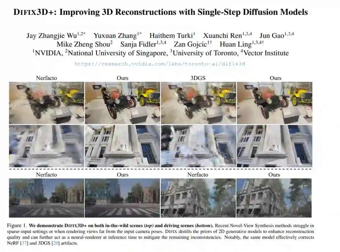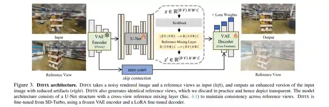 DIFIX3D+的核心是DIFIX,一种单步图像扩散模型,专门用于增强并消除由3D表示中欠约束区域引起的渲染新视角中的伪影。DIFIX在我们的流程中扮演两个关键角色: 1. 重建阶段:DIFIX用于清理从重建中渲染的伪训练视图,然后将其蒸馏回3D表示中。这极大地增强了欠约束区域,并提高了整体3D表示的质量。 1. 推理阶段:DIFIX作为神经增强器,有效消除了由于不完美的3D监督和当前重建模型能力有限而产生的残留伪影。