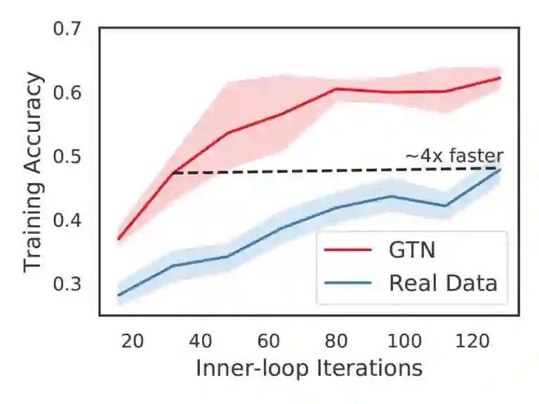 这篇论文探讨了一个有趣的问题,即我们是否可以创建自动生成训练数据、学习环境和课程的学习算法,以帮助人工智能智能体快速学习。我们证明了这种算法可以通过生成式教学网络(GTNs)来实现,生成式教学网络是一种理论上适用于有监督、无监督和强化学习的通用方法,尽管我们的实验只关注有监督的情况。GTNS是生成数据和训练环境的深度神经网络,学习者(例如,一个新初始化的神经网络)在对目标任务进行测试之前需要进行几个SGD步骤的训练。然后,我们通过元梯度来区分整个学习过程,更新GTN参数,以提高目标任务的性能。GTNS的有益特性是,理论上它们可以生成任何类型的数据或培训环境,从而使它们的潜在影响很大。本文介绍了GTNS,讨论了它们的潜力,并展示了它们可以极大地加速学习。我们还演示了一个实际的和令人兴奋的应用:加速评估候选架构的神经架构搜索(NAS),这是由这种评估的速度限制,使大量的加速在NAS。GTN-NAS改进了NAS的状态,在控制搜索建议机制时可以找到性能更好的架构。GTN-NAS还可以与现有的最先进的方法相竞争,这些方法在使用比典型NAS方法少几个数量级的计算量的情况下获得最佳性能。展望未来,GTNs可能代表着朝着算法的宏伟目标迈出的第一步,算法可以生成自己的训练数据,并在此过程中打开各种有趣的新研究问题和方向。